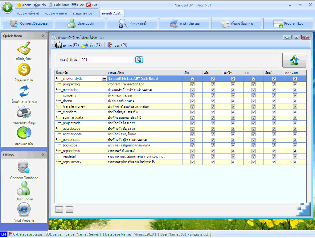 - การกำหนดสิทธิ์การใช้งานของผู้ใช้ เช่น ไม่ให้ผู้ใช้เพิ่มข้อมูล, แก้ไขข้อมูล, ลบข้อมูลและพิมพ์ข้อมูลหรือเรียกใช้เมนูซึ่งสามารถกำหนดได้ในแต่ละฟอร์มการทำงาน