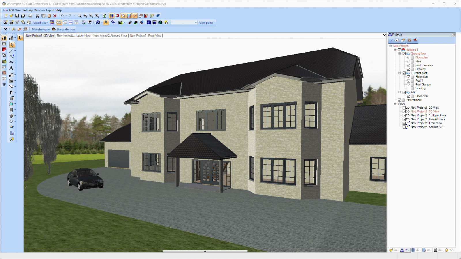 โปรแกรมออกแบบสถาปัตยกรรม รุ่นเริ่มต้น Ashampoo 3D CAD Architecture 11 สามารถออกแบบดีไซน์ได้หลายมุมมอง ทั้งแบบ 2 มิติ (2D) 3 มิติ (3D) และแบบ Cross Section มีหน่วยการวัดที่แม่นยำ รองรับการคำนวณพื้นที่ ความยาว และความจุ สามารถใส่รายละเอียดเล็ก ๆ น้อย เช่น หลังคา ประตู กำแพง รวมทั้งป้อนค่า ความกว้าง ยาว ของแต่ละส่วนประกอบได้ ภายในโปรแกรมมีแคตตาล็อก สิ่งของต่าง ๆ ที่สามารถนำมาตกแต่งเสริมภายในโปรแกรมให้เลือกสรรได้มากมาย เป็นโปรแกรมที่มีความสามารถในลักษณะเดียวกับ โปรแกรม SketchUp