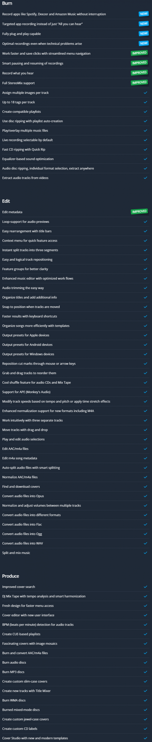 ตารางแจกแจงฟีเจอร์ โปรแกรม Ashampoo Music Studio 11