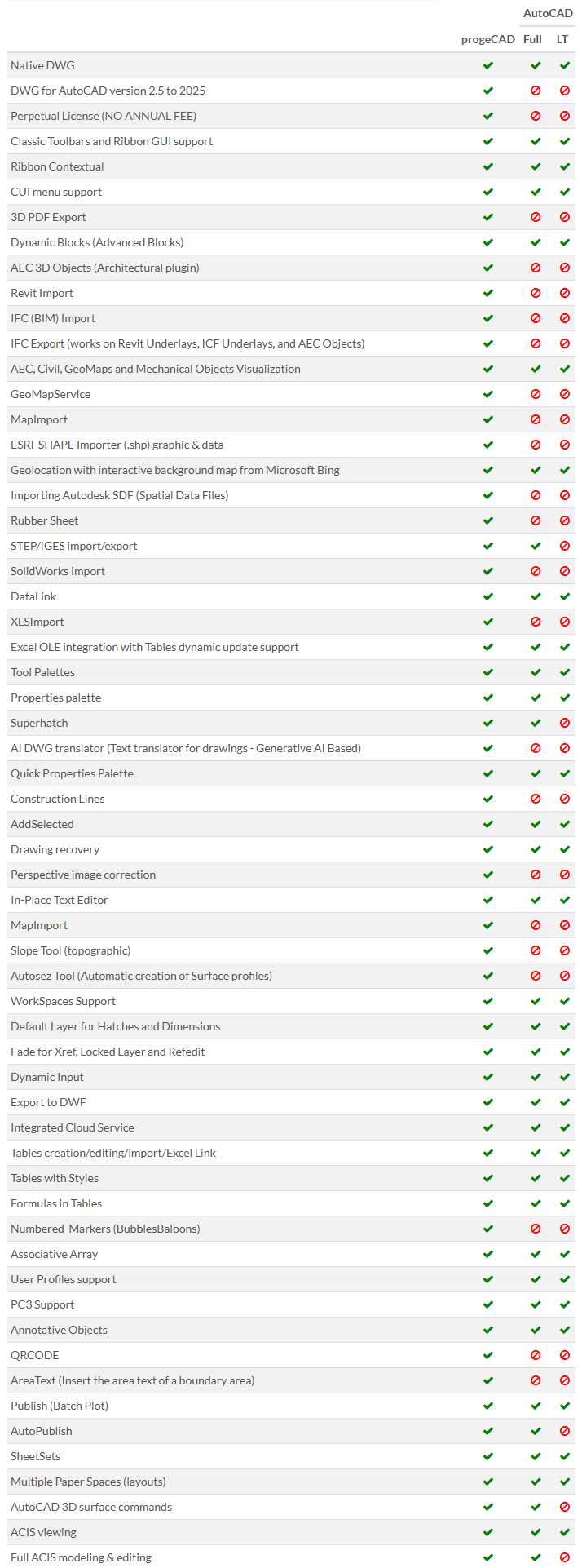 ตารางเปรียบเทียบความสามารถระหว่าง โปรแกรม progeCAD Professional และโปรแกรม AutoCAD และ AutoCAD LT