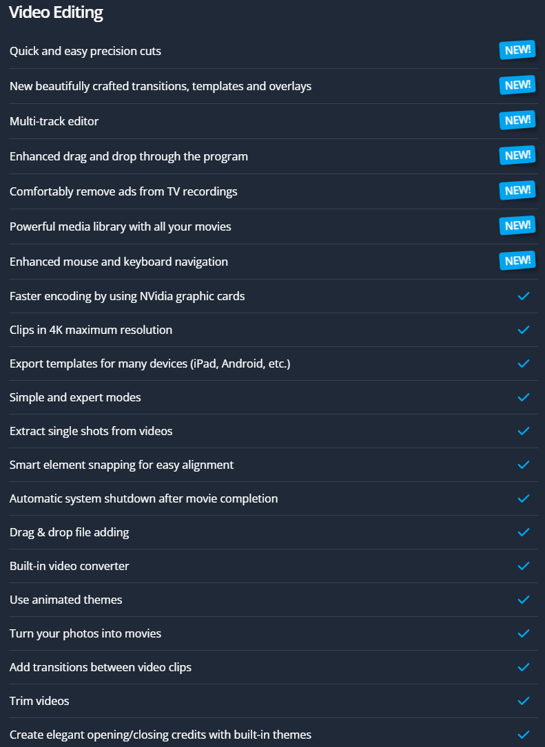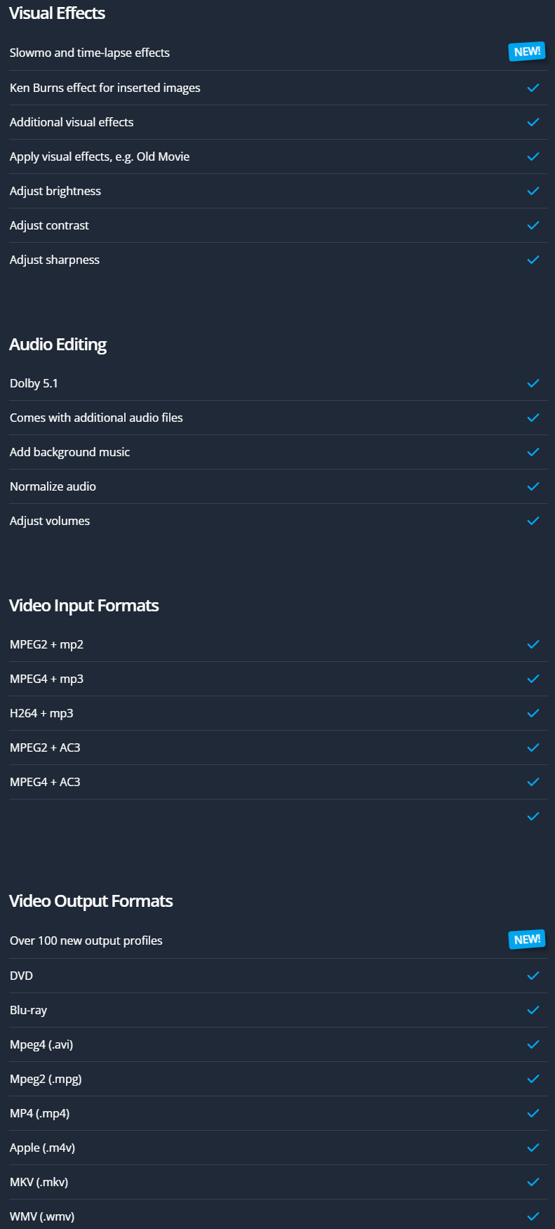 ตารางแจกแจงฟีเจอร์ โปรแกรมตัดต่อวิดีโอ Ashampoo Movie Studio Pro
