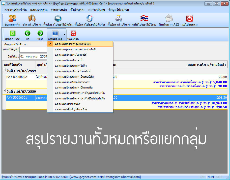 โปรแกรมงานไปรษณีย์ จุดรับชำระค่าบริการ iPayPost Software นั้น สามารถออกรายงานสรุปยอดต่างๆ ได้อย่างง่ายดาย ทั้งรายงานทั้งหมด หรือรายงานแยกกลุ่ม โดยรายงานจะแสดงผลบนหน้าจอได้โดยไม่ต้องสั่งพิมพ์ (Print) จึงเรียกดูได้อย่างสะดวก รวดเร็ว นอกจากนี้ยังสามารถส่งออกไฟล์ในรูปแบบของไฟล์ Microsoft Excel เพื่อนำไปประมวลผล วิเคราะห์ข้อมูลต่างๆ ได้อีกด้วย