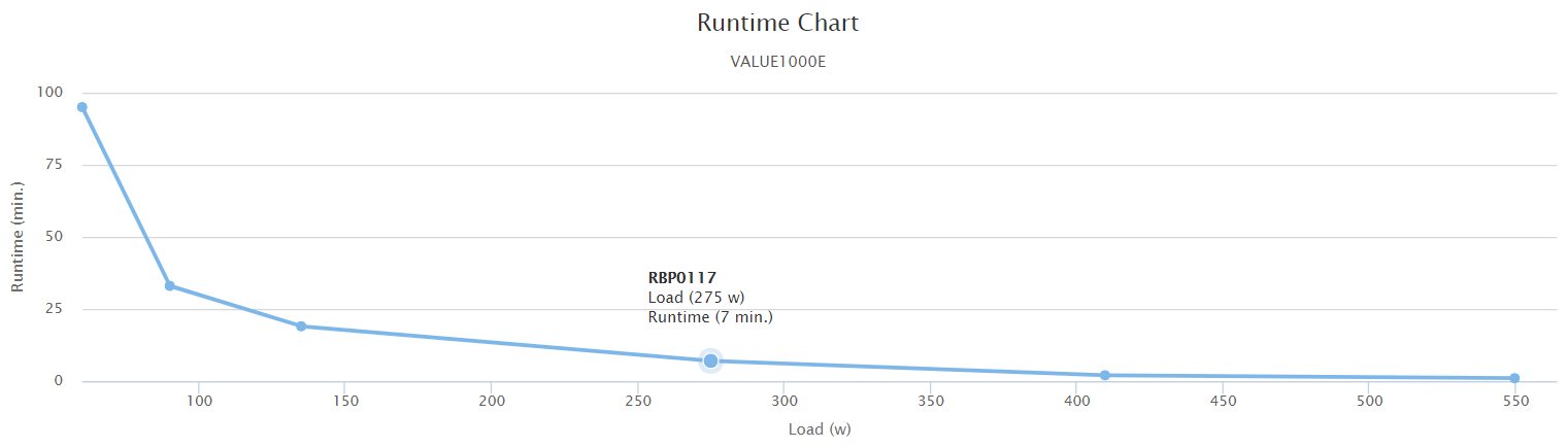 เครื่องสำรองไฟคอมพิวเตอร์ CyberPower VALUE 1000 E-AS รองรับกำลังการจ่ายไฟสูงสุด 550 วัตต์ โดยกราฟแสดงระยะเวลาการจ่ายพลังงานสำรองของ UPS รุ่นนี้ตามภาพด้านบน (Runtime Chart) ระบุว่า