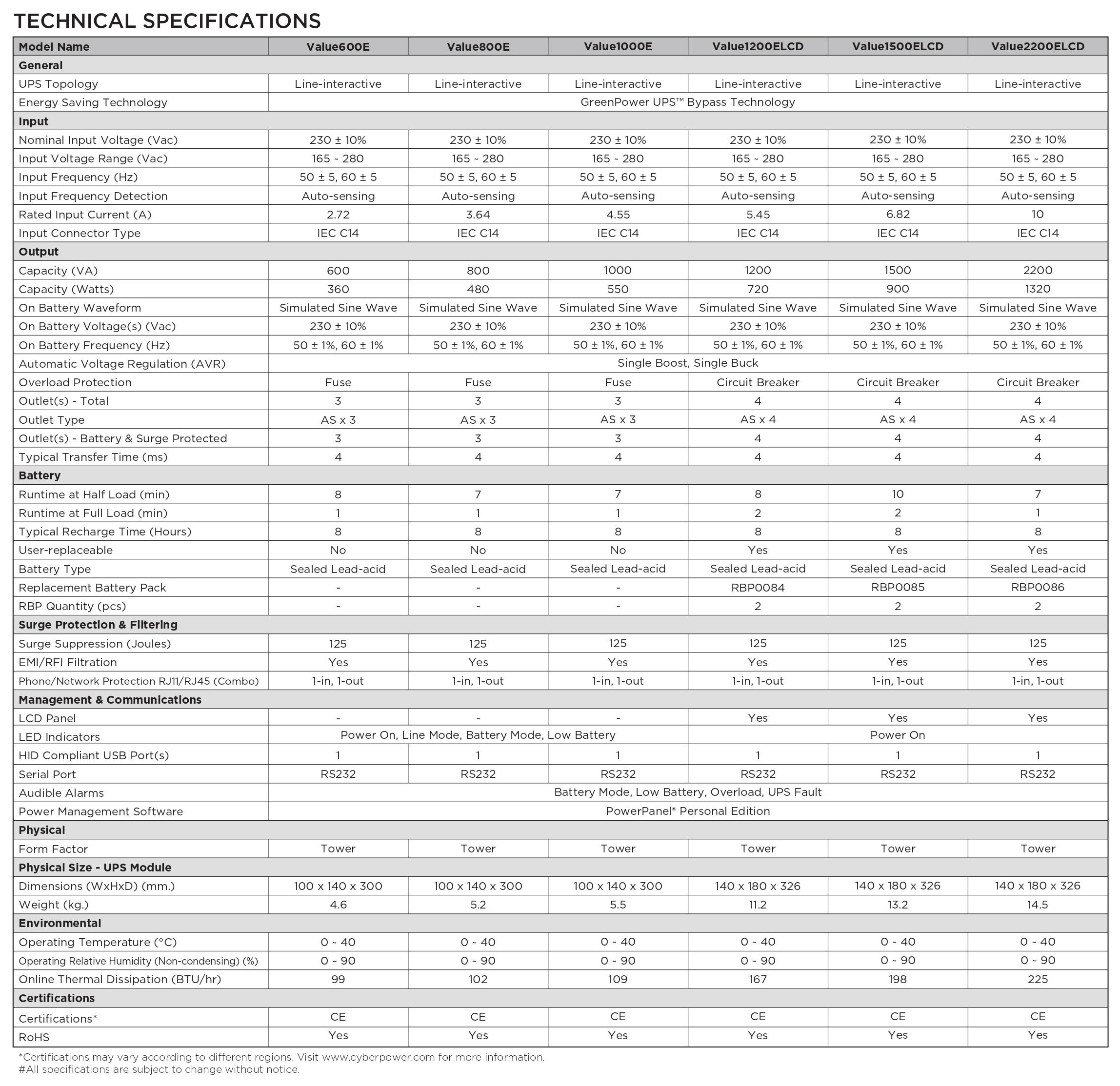 ตารางเปรียบเทียบ เครื่องสำรองไฟคอมพิวเตอร์ CyberPower ตระกูล VALUE