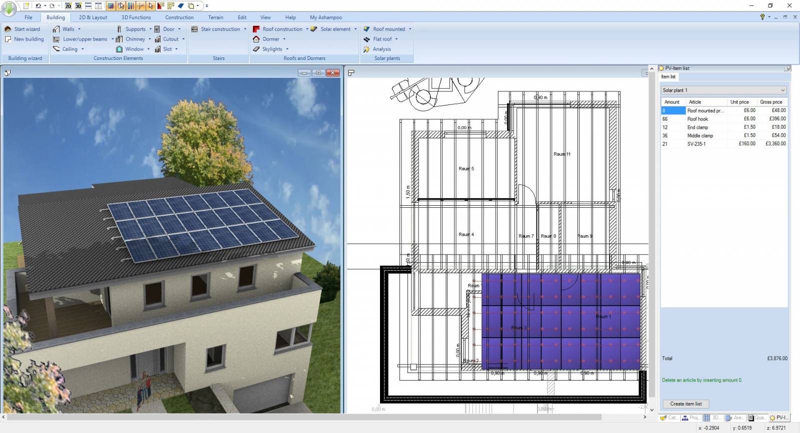เมื่อแบบอาคารเริ่มลงตัวแล้ว ก็สามารถวางใส่ชุดโซล่าเซลล์ลงไปบนหลังคาได้อย่างรวดเร็ว แค่เพียงคลิกเมาส์ 2 ครั้ง แล้วทำการจัดระยะห่างระหว่างแถวของแผงโซล่าเซลล์ และทำการหมุนทิศทางของแผงให้ถูกต้องได้ตามต้องการ ทำให้ โปรแกรมออกแบบสถาปัตยกรรม รุ่นโปร Ashampoo 3D CAD Professional 11 เหมาะมากสำหรับการออกแบบอาคารในยุคใหม่