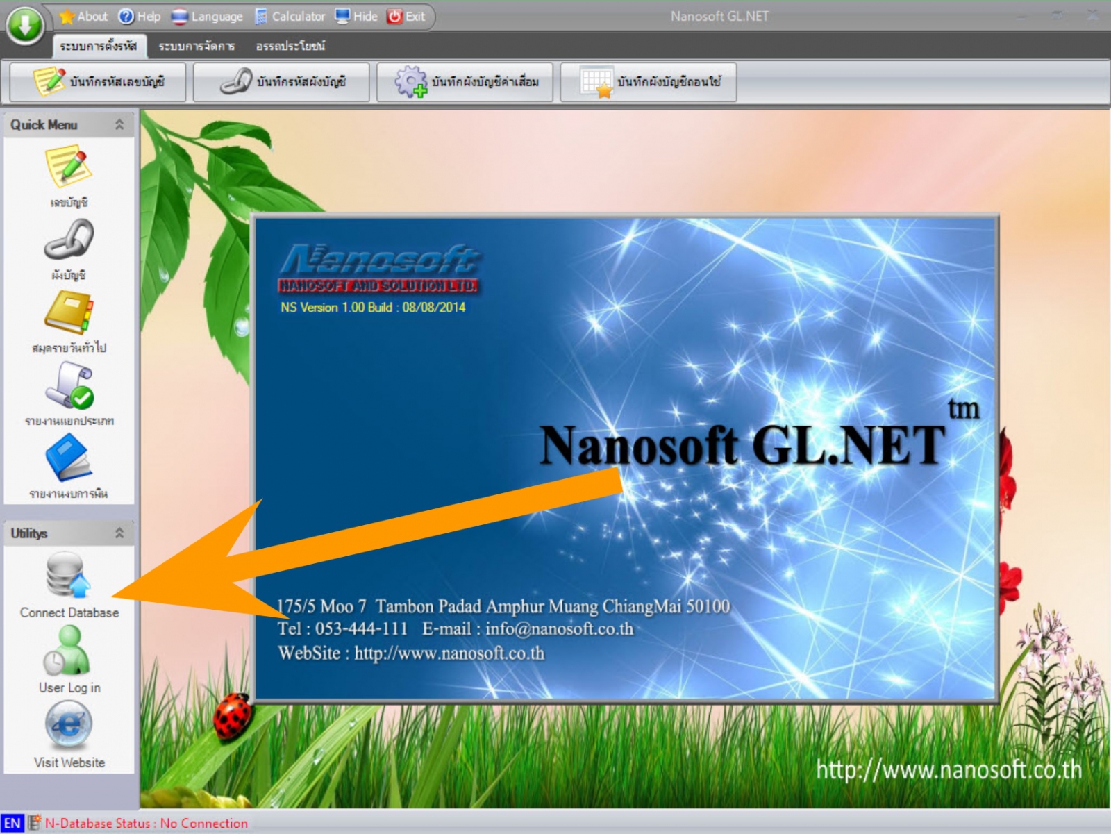 ในการทดลองใช้งานนั้น ลูกค้าจะต้องทำการเชื่อมต่อฐานข้อมูล ที่ด้านซ้ายมือก่อนเป็นอันดับแรก (คำสั่ง Connect Database ตามลูกศรชี้) โดยเลือกไฟล์ทดลองใช้งานที่ติดมากับโปรแกรม และใส่รหัสผ่านดังนี้