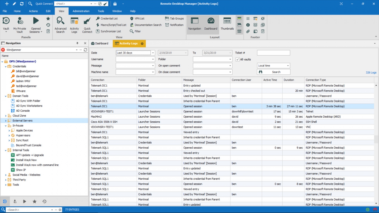 โปรแกรมรีโมทคอมพิวเตอร์ รุ่นองค์กรธุรกิจ Remote Desktop Manager Enterprise สามารถ เฝ้าดู ตรวจสอบ และวิเคราะห์ เวลาที่ผู้ใช้งานแต่ละคนใช้ไปกับการเข้าถึงเครื่อง คอมพิวเตอร์/เซิร์ฟเวอร์ เพื่อตรวจสอบประสิทธิภาพ และความถูกต้องเหมาะสม ในการทำงานของทีมงานผู้ดูแลระบบแต่ละคน โดยมี Activity Log ที่เก็บบันทึกข้อมูลว่า แต่ละการเชื่อมต่อดำเนินการโดย ใคร เมื่อไหร่ และอย่างไร รวมถึงยังสามารถเฝ้าดูแบบเรียลไทม์ว่าในขณะนี้ มีผู้ใช้งานคนไหนกำลังทำการเชื่อมต่ออยู่บ้าง