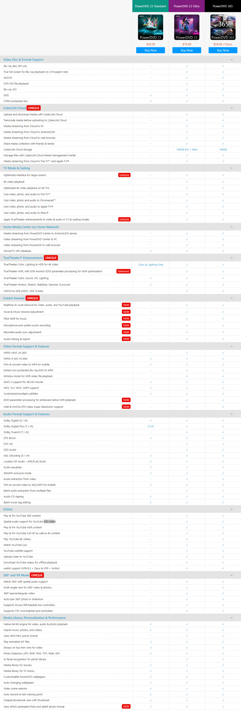 ตารางเปรียบเทียบ โปรแกรมดูหนัง เล่นสื่อบันเทิง ยอดนิยม CyberLink PowerDVD ในแต่ละเวอร์ชัน