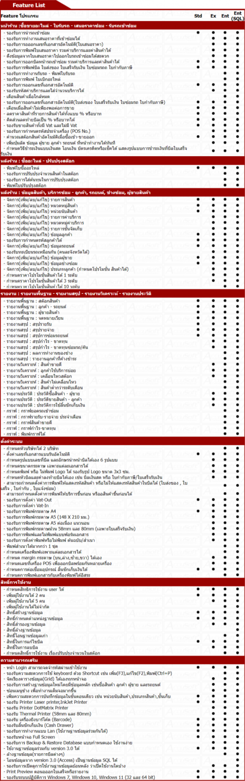 ตารางเปรียบเทียบ โปรแกรมอู่ซ่อมรถ Accusoft Car Service Manager ในแต่ละเวอร์ชัน