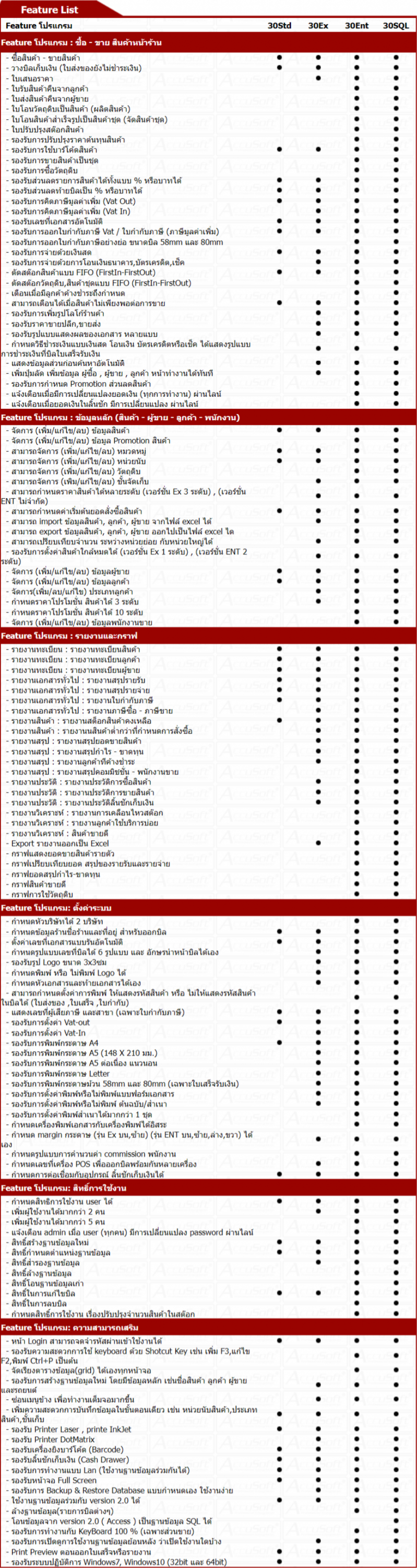 ตารางเปรียบเทียบ โปรแกรม Accusoft Stock Manager ในแต่ละเวอร์ชัน