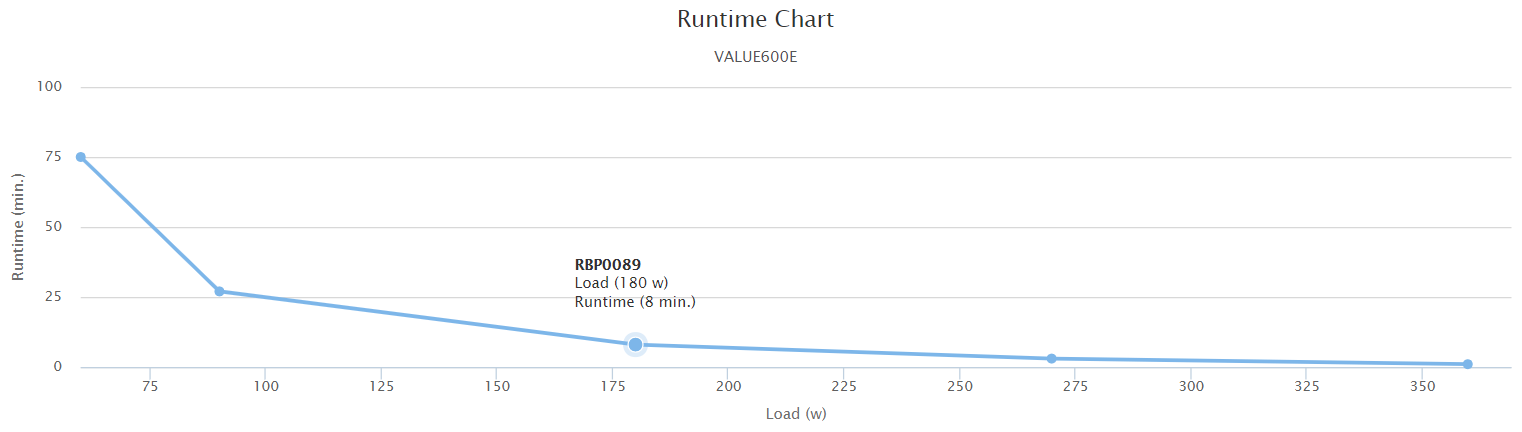 เครื่องสำรองไฟ CyberPower VALUE 600 E-AS รองรับกำลังการจ่ายไฟสูงสุด 360 วัตต์ โดยกราฟแสดงระยะเวลาการจ่ายพลังงานสำรองของ UPS รุ่นนี้ตามภาพด้านบน (Runtime Char) ระบุว่า