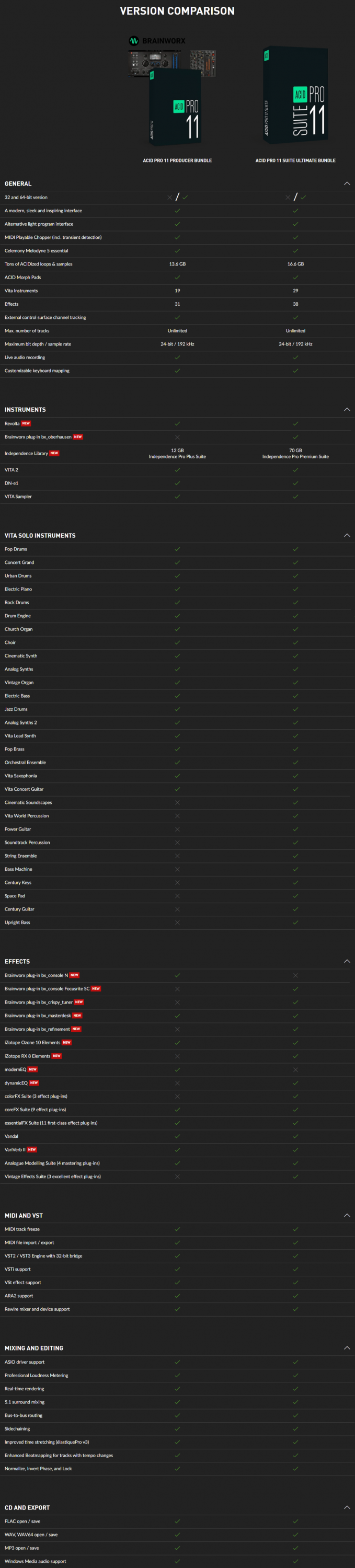 ตารางเปรียบเทียบความสามารถ โปรแกรมทำเพลง แต่งเสียง ACID Pro ในแต่ละเวอร์ชัน