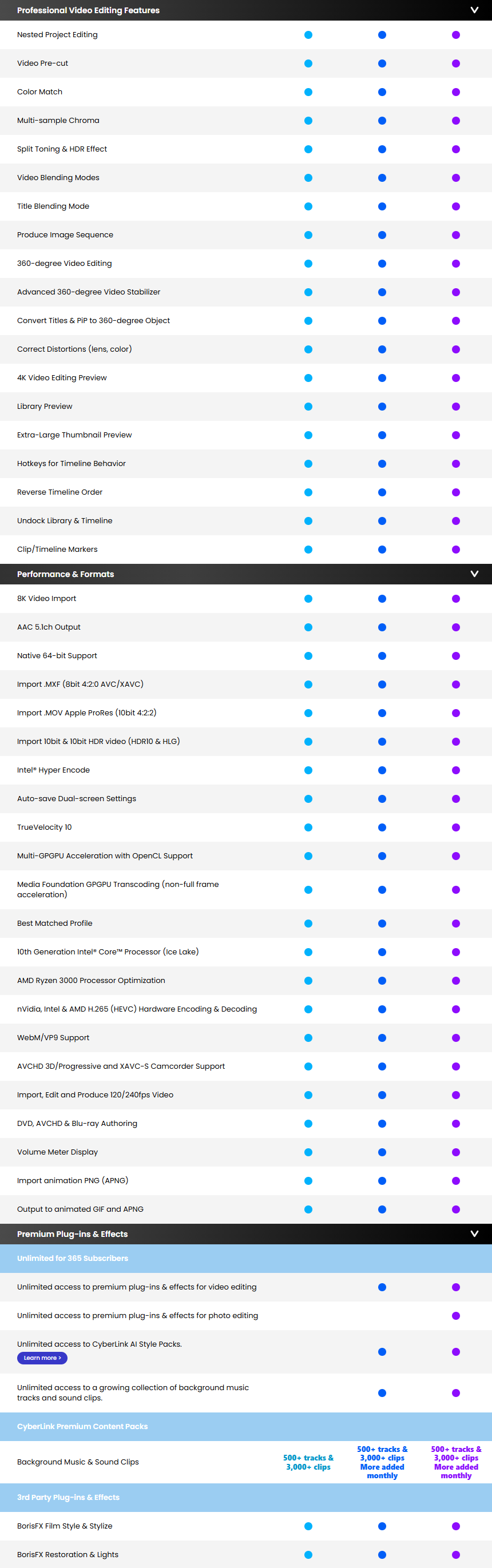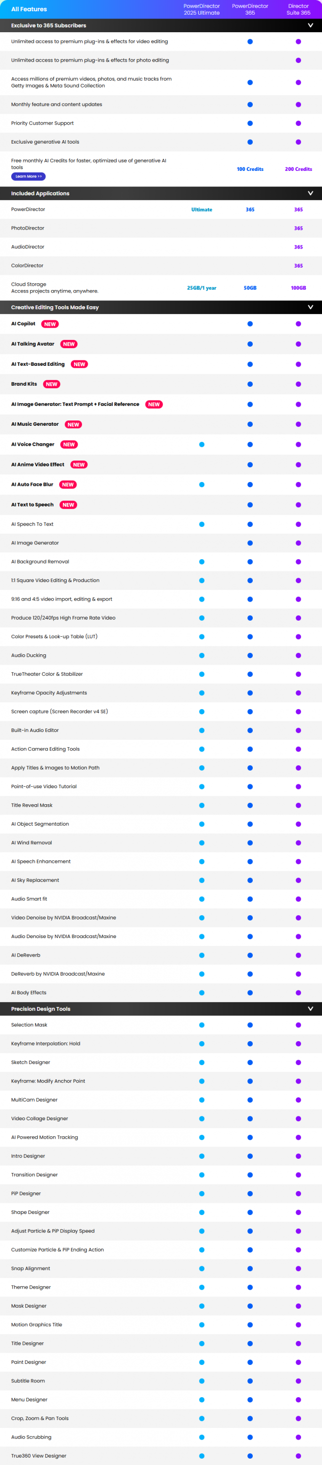 ตารางเปรียบเทียบ โปรแกรมตัดต่อวิดีโอ CyberLink PowerDirector ในแต่ละเวอร์ชัน