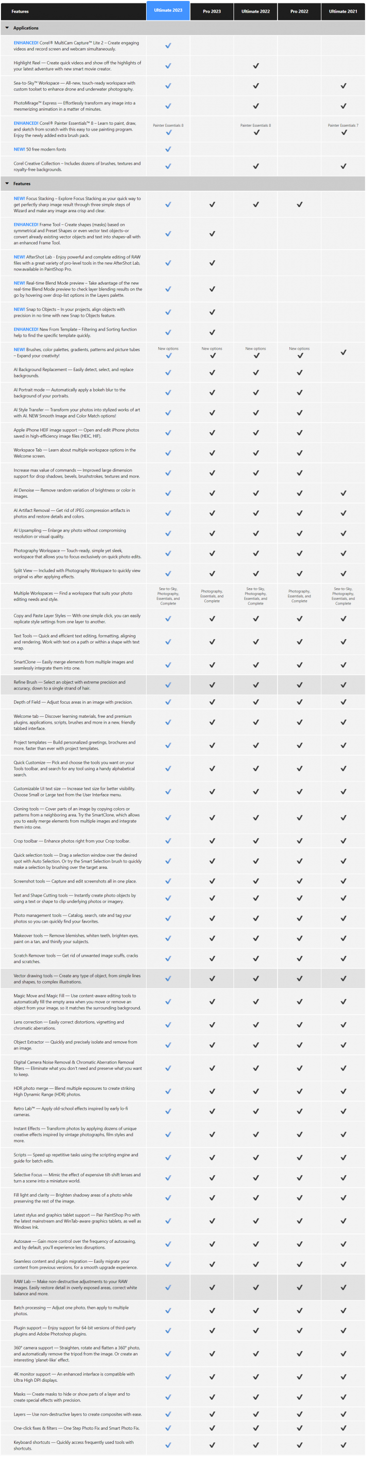 ตารางเปรียบเทียบ โปรแกรมแต่งรูป แก้ไขรูป PaintShop ในแต่ละเวอร์ชัน