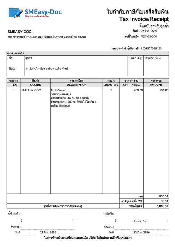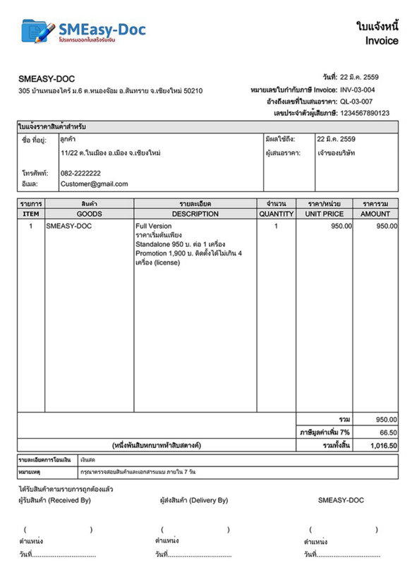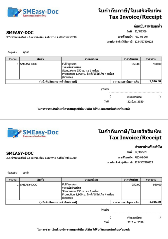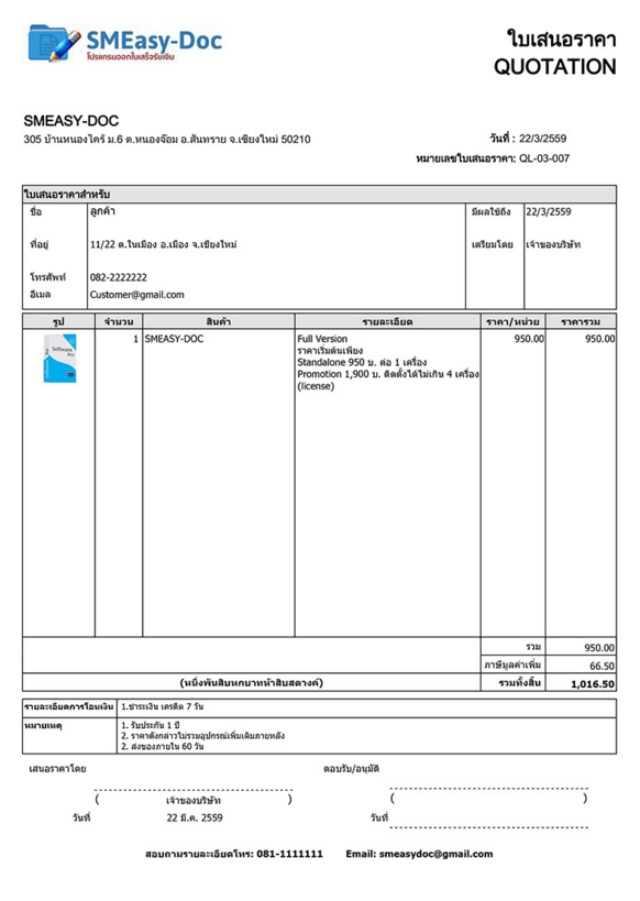 SMEasy Doc โปรแกรมออกใบเสนอราคา ออกใบเสร็จ จัดการเอกสารสำคัญ ที่จำเป็นต้องใช้ในด้านธุรกิจ แทบจะทุกประเภทเลยก็ว่าได้ ไม่ว่าจะเป็นการ ออกใบเสร็จรับเงิน (Receipt) ใบกำกับสินค้า หรือ ใบแจ้งหนี้ (Invoice) ตลอดจน ออกใบเสนอราคา (Quotation) พร้อมกับมีความสามารถในการจัดเก็บข้อมูล พร้อม ประวัติการออกเอกสารต่างๆ เพื่อให้สามารถแทร็ก ดูรายงาน (Report) ย้อนหลังได้เป็นอย่างดี นอกจากนี้แล้ว โปรแกรม SMEasy-Doc ตัวนี้ยังสามารถจำกัดและกำหนดสิทธิ์ในการเข้าถึงข้อมูล (Access Privilege) ได้อีกด้วย เช่น ผู้ใช้งานคนนี้สามารถออกได้แค่ใบเสนอราคา แต่ไม่สามารถออกใบเสร็จได้ แบบนี้เป็นต้น ก็สามารถกำหนดสิทธิ์ของผู้ใช้งานได้เช่นกัน เรียกได้ว่าใครที่ประกอบธุรกิจอยู่ คงจะทราบดีกว่า เอกสารทั้งหลายเหล่านี้ หากไม่มีระบบบริหารจัดการที่ดีนั้นจะเป็นสิ่งที่ยุ่งยากและวุ่นวายมากๆ ดังนั้น ควรจะต้องนำเข้าระบบ วางระบบเอกสารดังกล่าวให้ดีเสียตั้งแต่ตอนแรก