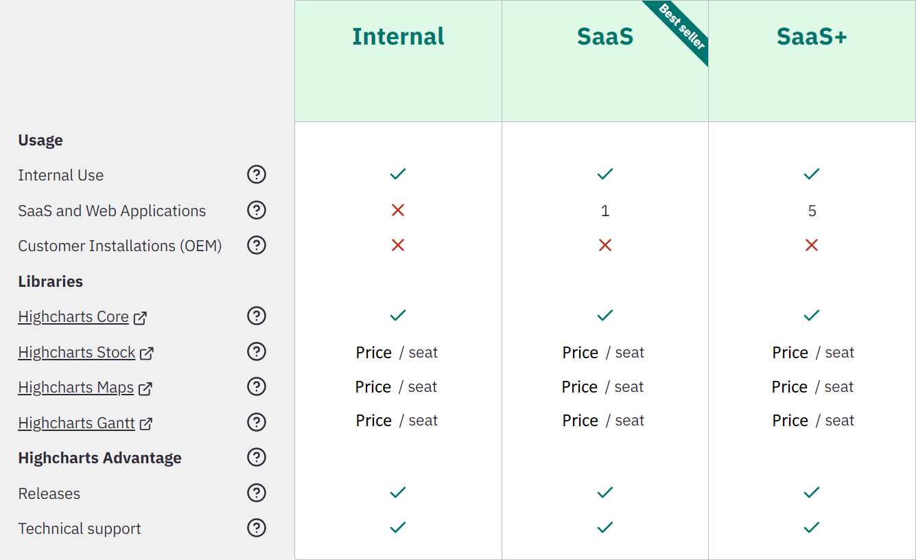 โดยลิขสิทธิ์ระดับมาตรฐานมาพร้อมกับ Library สำหรับการแสดงแผนภูมิในระดับพื้นฐาน (Highcharts Core) และมี Library เสริม ให้เลือกซื้อได้ 3 รูปแบบ อาทิ Highcharts Stock, Highcharts Maps และ Highcharts Gantt