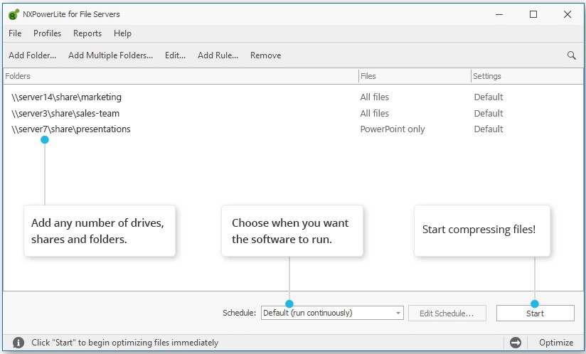 โปรแกรมบีบอัดไฟล์บนเซิร์ฟเวอร์ NXPowerLite for File Servers จะทำการบีบย่อขนาดไฟล์ใน เครื่องเซิร์ฟเวอร์ เครื่องคอมพิวเตอร์ หรือสื่อเก็บข้อมูลใดๆ ที่อยู่ในระบบเครือข่าย หรืออยู่ใน Windows Domain เดียวกับเครื่องเซิร์ฟเวอร์ที่ติดตั้งโปรแกรมตัวนี้ ซึ่งการสั่งงานบีบย่อขนาดไฟล์ ทำได้ง่ายๆ ในเพียง 3 ขั้นตอน ดังนี้