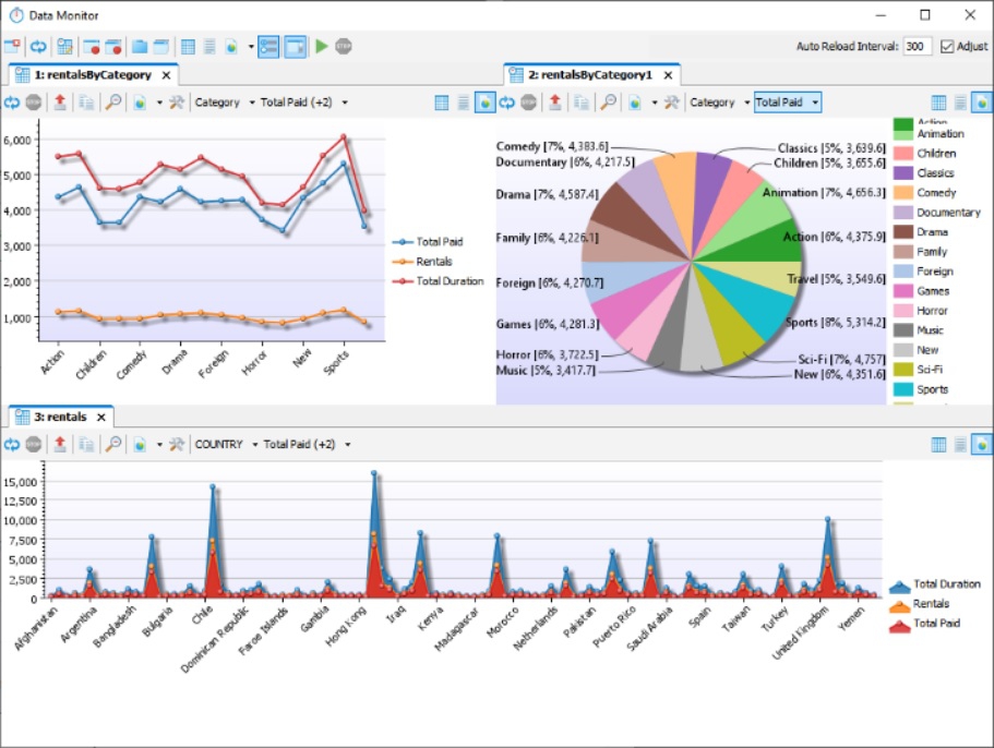 ใน โปรแกรมดูแลฐานข้อมูล DbVisualizer Pro มีเครื่องมือในการตรวจสอบ สอดส่อง หรือมอนิเตอร์ (Monitor) สำหรับนักวิเคราะห์ข้อมูล ที่สามารเรียกดูแนวโน้มความเปลี่ยนแปลงของข้อมูลในแต่ละช่วงเวลา และสามารถนำเสนอข้อมูลผ่านกราฟและแผนภูมิหลายรูปแบบ รวมถึงสามารถสามารถแสดงให้เห็นถึงความเปลี่ยนแปลงของข้อมูลที่มีการอัปเดตแบบสดๆ (Real-time) ได้อีกด้วยเช่นกัน ถือว่าเป็นเครื่องมือช่วยประกอบการตัดสินใจทางธุรกิจได้เป็นอย่างดี