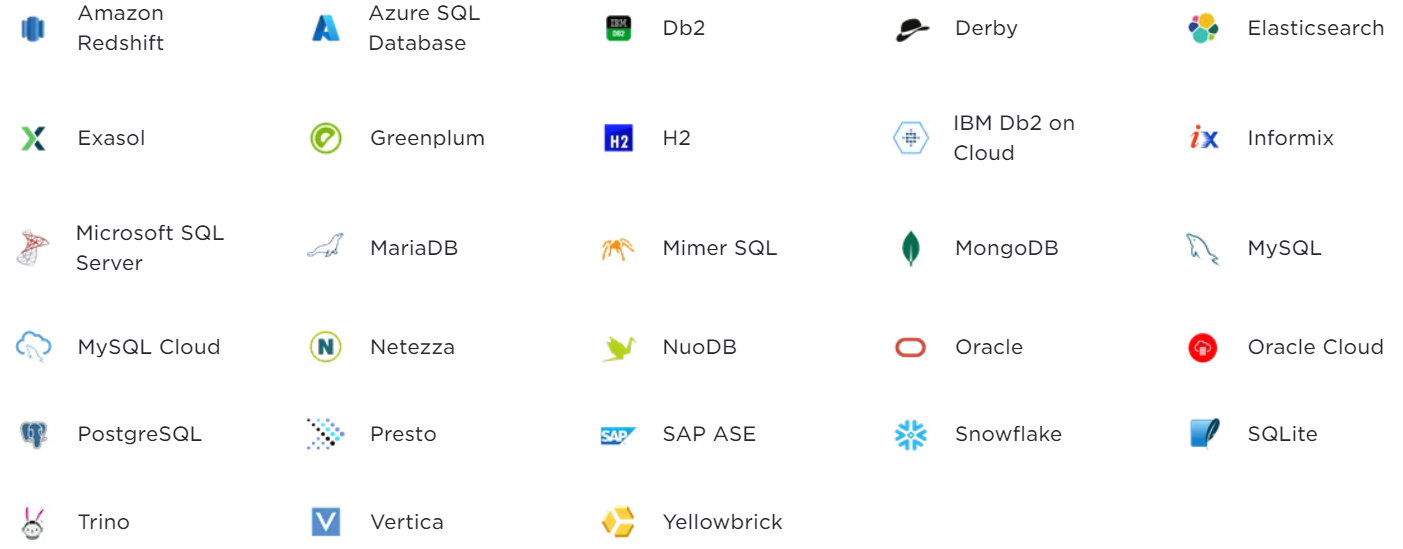 โปรแกรมดูแลฐานข้อมูล DbVisualizer Pro มีจุดเด่นตรงที่รองรับการดูแลรูปแบบฐานข้อมูลประเภทหลัก ๆ ที่นิยมใช้ในองค์กรธุรกิจอย่างครบถ้วน ตอบความต้องการของทั้ง นักพัฒนาโปรแกรม ผู้ดูแลระบบฐานข้อมูล และนักวิเคราะห์ข้อมูล ที่ต้องทำงานกับฐานข้อมูลที่มีความแตกต่างหลากหลายได้เป็นอย่างดี โดยรายชื่อของรูปแบบฐานข้อมูลที่ โปรแกรมดูแลฐานข้อมูล DbVisualizer Pro รองรับก็มี อาทิ