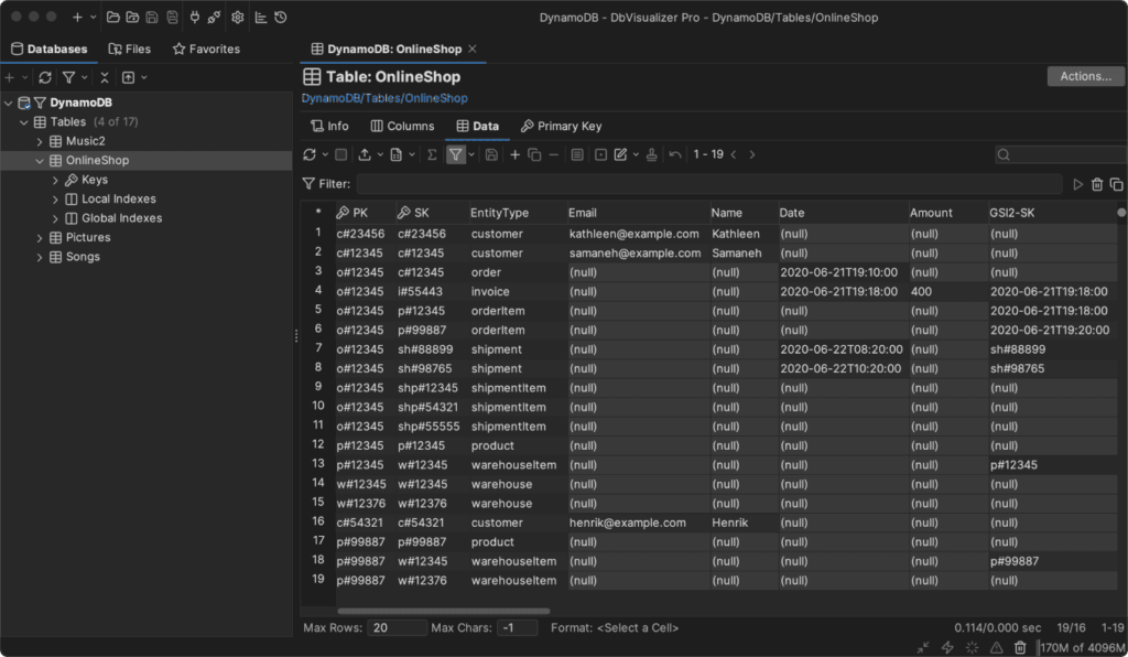 โปรแกรมดูแลฐานข้อมูล DbVisualizer Pro รองรับการทำงานกับฐานข้อมูล Amazon DynamoDB มาพร้อมกับฟังก์ชันที่ดี อาทิ การตรวจสอบโครงสร้างตาราง เช่น Keys, Indexes และ Attributes สามารถแก้ไขข้อมูลในตารางได้โดยตรง รวมถึงข้อมูลประเภท Complex เช่น Map และ Set และยังสามารถรันคำสั่ง PartiQL ผ่าน SQL Commander ได้ทันที