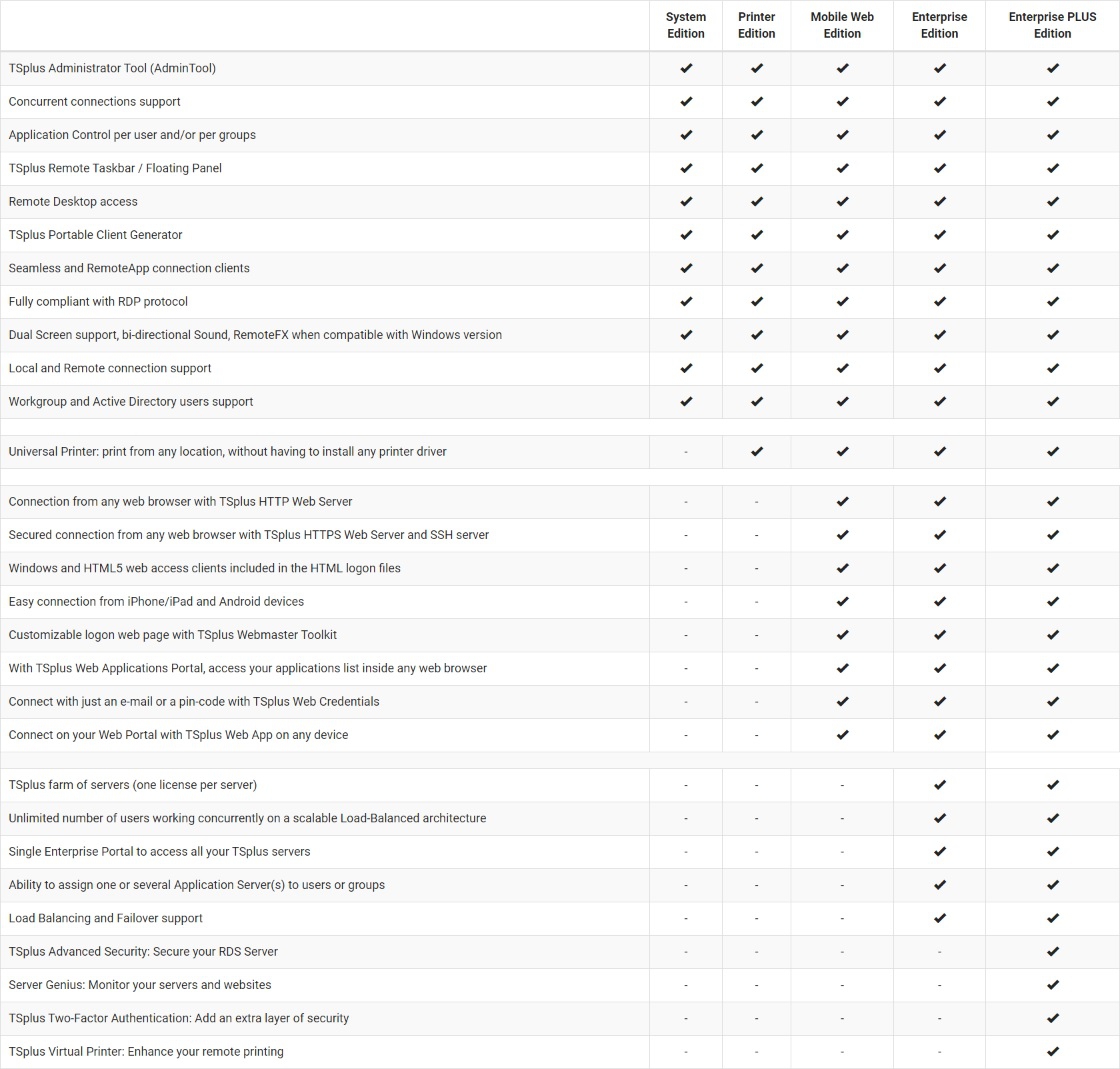 ตารางเปรียบเทียบความสามารถ โปรแกรม Remote Desktop Services รุ่นองค์กรธุรกิจ TSplus Enterprise Edition