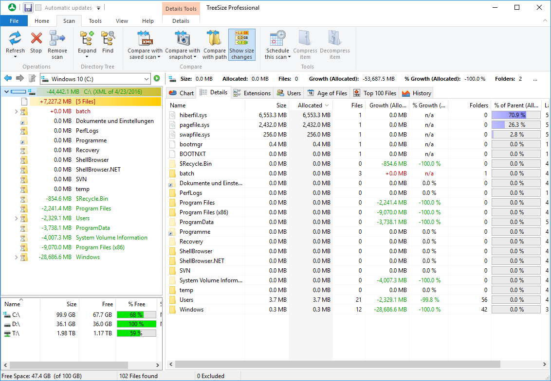 โปรแกรมดูพื้นที่บนฮาร์ดดิสก์รุ่นมืออาชีพ TreeSize Professional สามารถบันทึกข้อมูลการตรวจสอบพื้นที่ในฮาร์ดดิสก์ในรูปแบบของไฟล์ XML และสามารถโหลดข้อมูลที่บันทึกไว้ เพื่อนำมาเปรียบเทียบหาการขยายตัวของข้อมูลที่เก็บอยู่ในไดรฟ์ได้ ทำให้สามารถจัดการพื้นที่ได้อย่างมีประสิทธิภาพ โดยที่โปรแกรมสามารถแสดงให้เห็น ความแตกต่างระหว่างผลการตรวจสอบในอดีต (ที่เก็บไว้ในรูปแบบ XML) กับผลการตรวจสอบ ณ ปัจจุบันได้อย่างชัดเจน หรือถ้าไม่ต้องการบันทึกผลการตรวจสอบในรูปแบบไฟล์ XML ที่มีขนาดใหญ่ ก็สามารถบันทึกในรูปแบบการสร้าง Windows Snapshots ก็ได้
