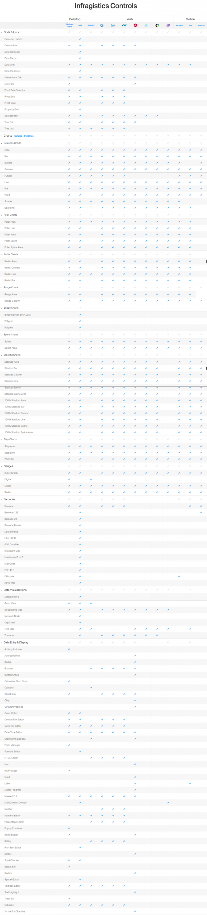 โปรแกรมรวมชุด UI Components และ Control ด้านการพัฒนาโปรแกรม Infragistics มาพร้อมไลบรารี่ที่สมบูรณ์แบบที่สุด สำหรับการพัฒนาเว็บแอปฟลิเคชันในแพลตฟอร์ม .NET รวมถึงการจัดการ Charts และ Data Grids ในรูปแบบ JavaScript และยังมีชุด UI Component และ Control อีกมากมาย ทำให้ Developer มีเครื่องมืออันทรงประสิทธิภาพ สำหรับการพัฒนาเว็บแอปฟลิเคชันสำหรับองค์กรธุรกิจ