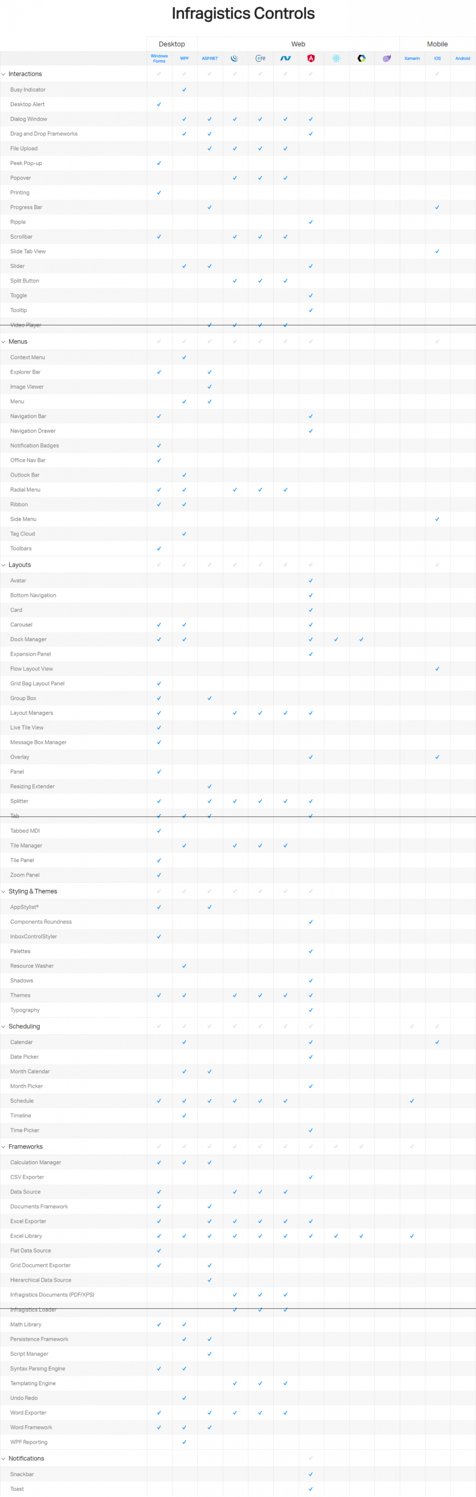 ตารางเปรียบเทียบ โปรแกรม Infragistics ในแต่ละเวอร์ชัน