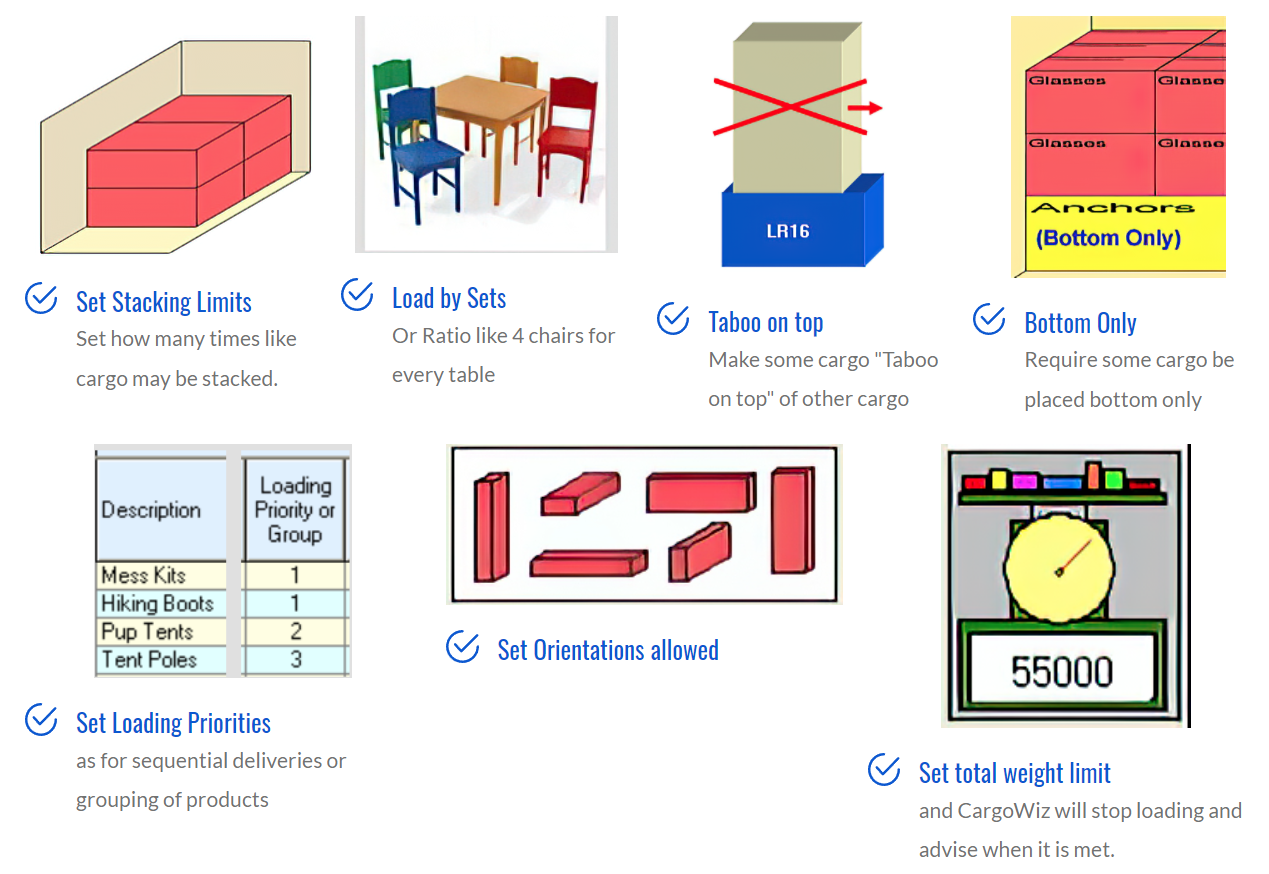 CargoWiz มันเป็น โปรแกรมช่วยจัดการธุรกิจ กิจการขนส่ง ทั้งการขนส่งสินค้าในประเทศ การขนส่งระหว่างประเทศ ออกแบบ และคำนวณวิธีการจัดเรียงพัสดุสินค้าให้เกิดการใช้งานพื้นที่ในตู้คอนเทนเนอร์ หรือพื้นที่ในรถบรรทุกอย่างคุ้มค่า ออกแบบการวางกล่องพัสดุซ้อนท้บกันเป็นชั้น ๆ อย่างเหมาะสม สามารถกำหนดกฎเกณฑ์การโหลดสินค้าได้หลากหลาย อาทิ การโหลดสินค้าเป็นชุด (Load by Sets เช่น โต๊ะ 1 ตัว ต่อเก้าอี้ 4 ตัว) กำหนดจำนวนชั้นของพัสดุที่สามารถวางซ้อนทับกัน และการกำหนด Limit น้ำหนักการโหลดของ เป็นต้น