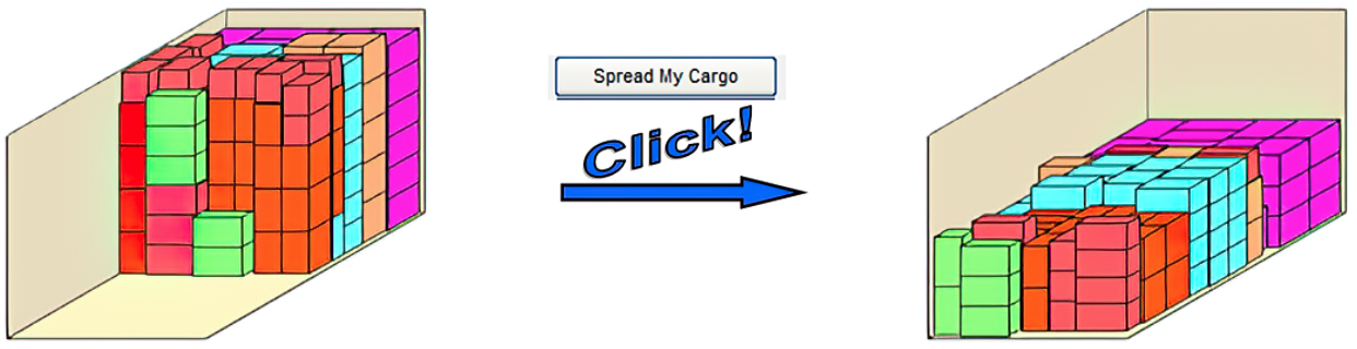 อีกหนึ่งฟีเจอร์ที่มีประโยชน์มากของ โปรแกรมคำนวณการจัดเรียงสินค้าเพื่อการขนส่ง CargoWiz คือฟีเจอร์ Spread My Cargo ที่ช่วยให้เรากระจายการจัดเรียงพัสดุให้เต็มตามขนาดความกว้างของ ตู้คอนเทนเนอร์/รถบรรทุก ได้อย่างง่ายดายด้วยการสั่งงานเพียงคลิกเดียว เพื่อเพิ่มความสมดุลในการขนส่งพัสดุไปถึงที่หมาย ช่วยลดความเสี่ยงที่กล่องพัสดุจะล้มตกลงมาจากกองสูง
