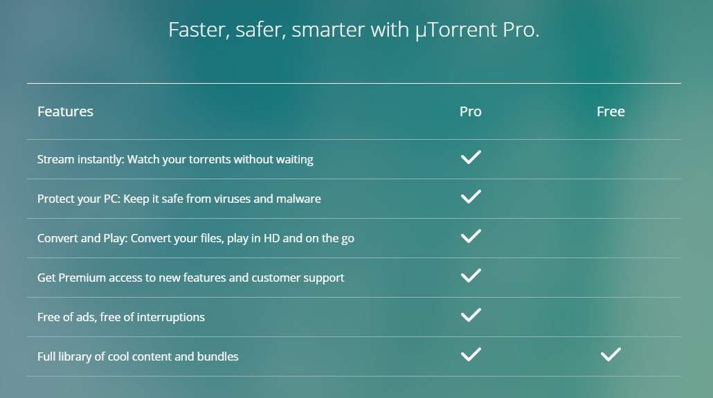 สิ่งที่ โปรแกรมโหลดบิท µTorrent Pro เหนือกว่าโปรแกรมเวอร์ชันใช้ฟรีคือ มันสามารถเปิดดูไฟล์หนังในขณะที่กำลังดาวน์โหลดมาได้เลย โดยไม่ต้องรอให้ดาวน์โหลดเสร็จก่อนแล้วค่อยเปิดดู และมีการสแกนหาไวรัสในไฟล์ที่ดาวน์โหลดโดยอัตโนมัติ ทำให้เครื่องเราปลอดภัย และยังมีฟีเจอร์อื่นๆ อีกมากมาย ที่ทำให้เวอร์ชัน Pro อยู่เหนือเวอร์ชันใช้งานฟรี