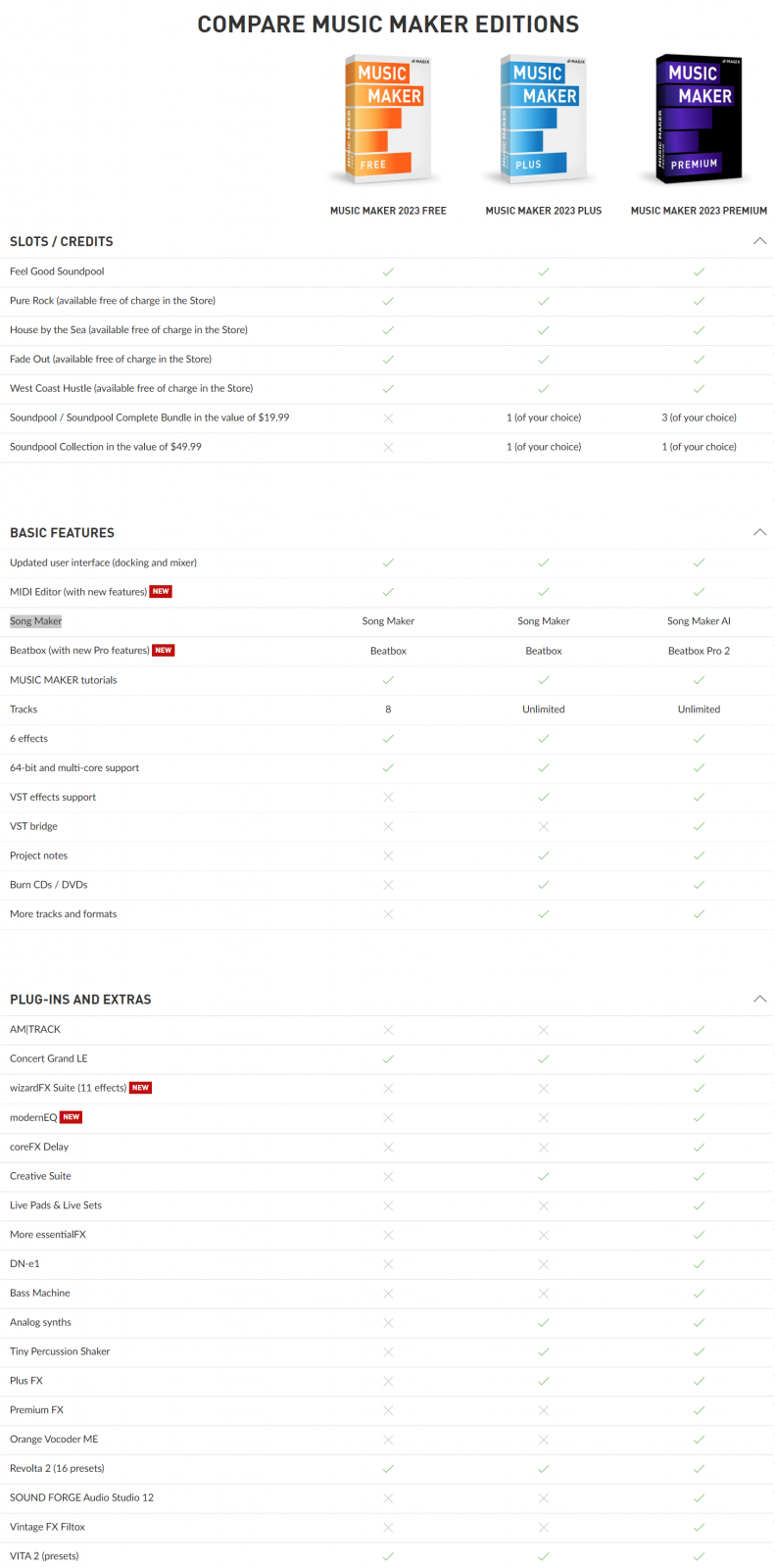 โปรแกรมทำเพลง รุ่นระดับกลาง Music Maker 2023 PLUS EDITION มีการปรับเปลี่ยนหน้าตาของโปรแกรมให้เป็นมิตรกับผู้ใช้งาน ทำให้เริ่มต้นสร้างสรรค์งานเพลงได้ง่ายขึ้น และไม่มีอะไรยุ่งยาก และด้วยการเปิดอิสระให้ผู้ใช้สามารถย้ายโมดูล และเครื่องมือ ไปวางในตำแหน่งต่าง ๆ ของหน้าจอได้ตามต้องการ ช่วยให้มืออาชีพด้านงานเพลง เข้าถึงเครื่อมือได้ง่ายขึ้น ในตำแหน่งที่ถนัด