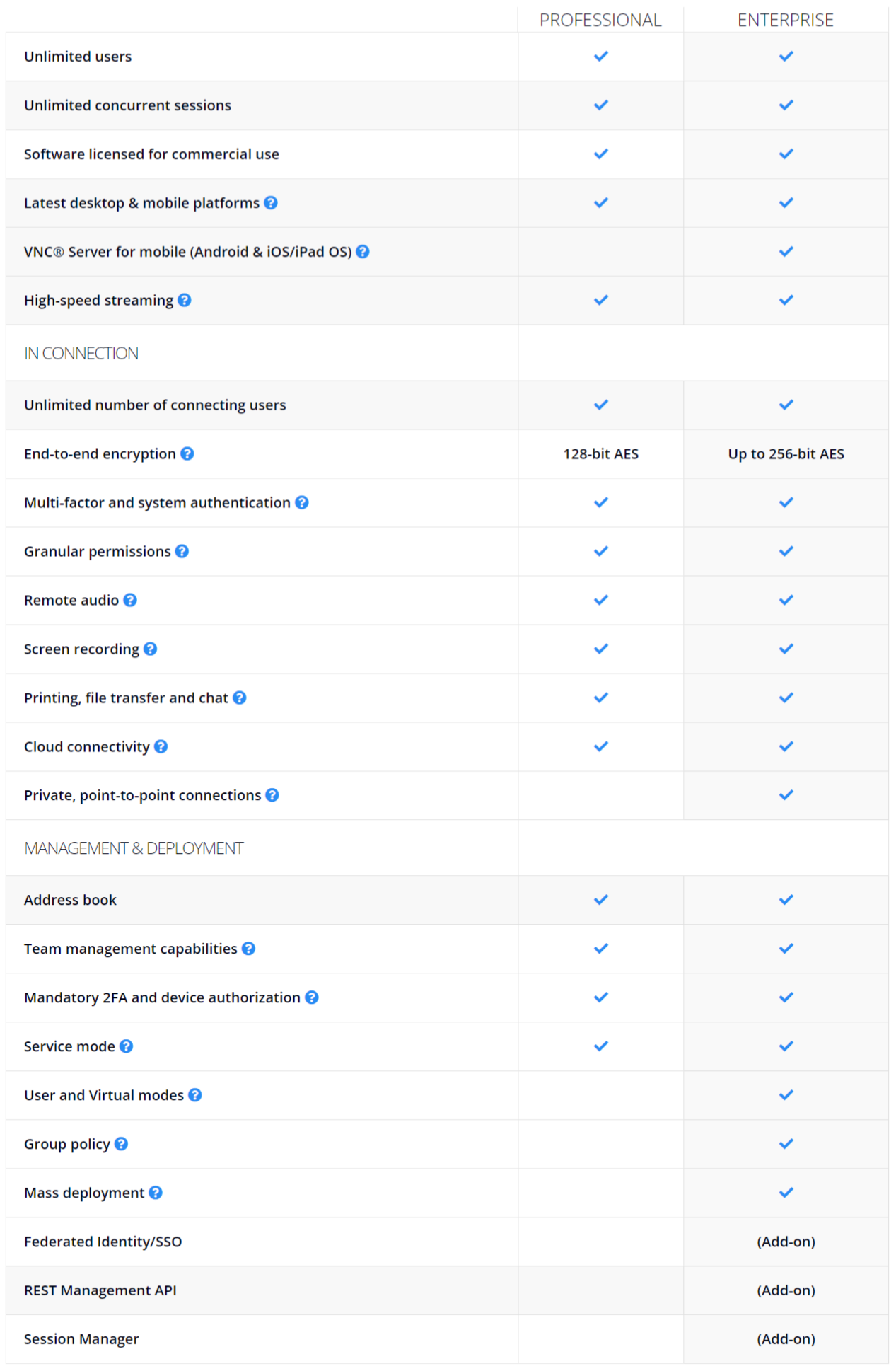 ตารางเปรียบเทียบ โปรแกรมรีโมทหน้าจอ VNC Connect Device Access ระหว่างรุ่น Professional และ Enterprise