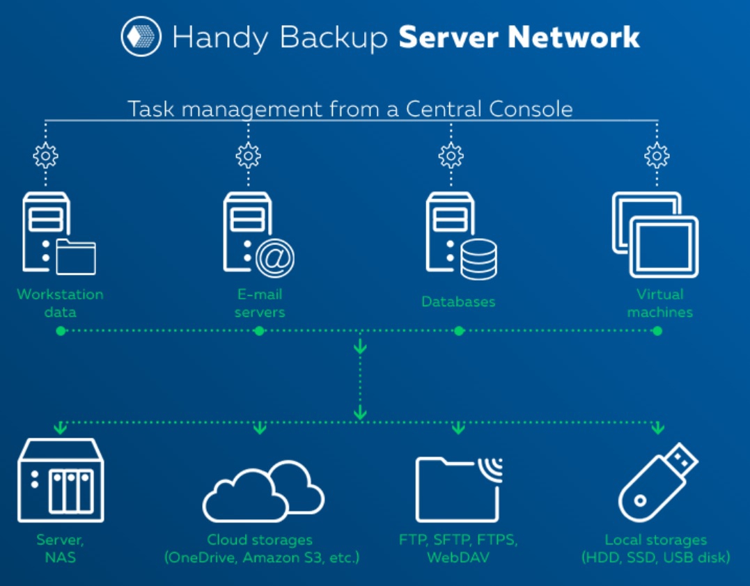 โปรแกรมสำรองข้อมูล Handy Backup มีความสามารถในการจัดการสำรองข้อมูล ในเครื่อง คอมพิวเตอร์/เซิร์ฟเวอร์ รวมถึงเครื่องบนระบบเสมือน (Virtual Machine) ทุกเครื่องที่อยู่ในระบบเครือข่ายขององค์กรธุรกิจ ได้จาก โปรแกรมคอนโซลส่วนกลาง (Central Console) ที่ติดตั้งอยู่บนคอมพิวเตอร์เครื่องหนึ่งที่เชื่อมต่ออยู่กับระบบเครือข่าย ช่วยให้ฝ่ายไอทีขององค์กรธุรกิจ สามารถดูแลเรื่องการสำรองข้อมูลให้กับ คอมพิวเตอร์/เซิร์ฟเวอร์/เครื่องเสมือน ได้อย่างทั่วถึงทุกเครื่อง โดยจัดการผ่านระบบเครือข่าย ไม่ต้องเดินทางไปถึงหน้าเครื่อง