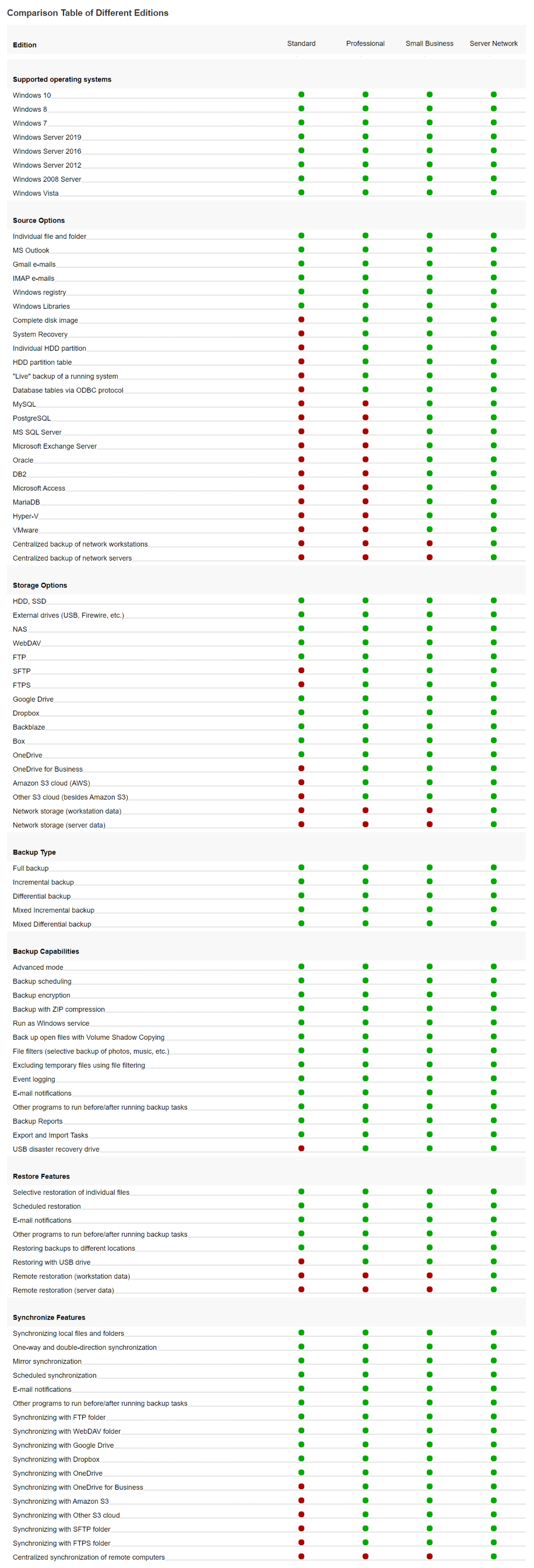 เก็บสำรองโฟลเดอร์ ไฟล์เอกสาร ไฟล์ภาพ ไฟล์วิดีโอ ไฟล์เพลง ข้อมูลอีเมลจาก โปรแกรม Microsoft Outlook รองรับการเก็บข้อมูลสำรอง เอาไว้ใน ฮาร์ดดิสก์ หรือ SSD ที่อยู่ภายในเครื่อง คอมพิวเตอร์/เซิร์ฟเวอร์ เอง เก็บไว้ในหน่วยเก็บข้อมูลแบบภายนอก อย่างเช่น ฮาร์ดดิสก์แบบภายนอก แฟลชไดรฟ์ เก็บไว้บนอุปกรณ์ NAS หรือเก็บไว้บนคลาวด์ สามารถเข้ารหัสข้อมูลที่เก็บสำรอง (Encryption) เพื่อรักษาความเป็นส่วนตัวของข้อมูล และบีบอัดข้อมูล (ZIP) เพื่อให้ประหยัดเนื้อที่ในการจัดเก็บข้อมูลได้ด้วย