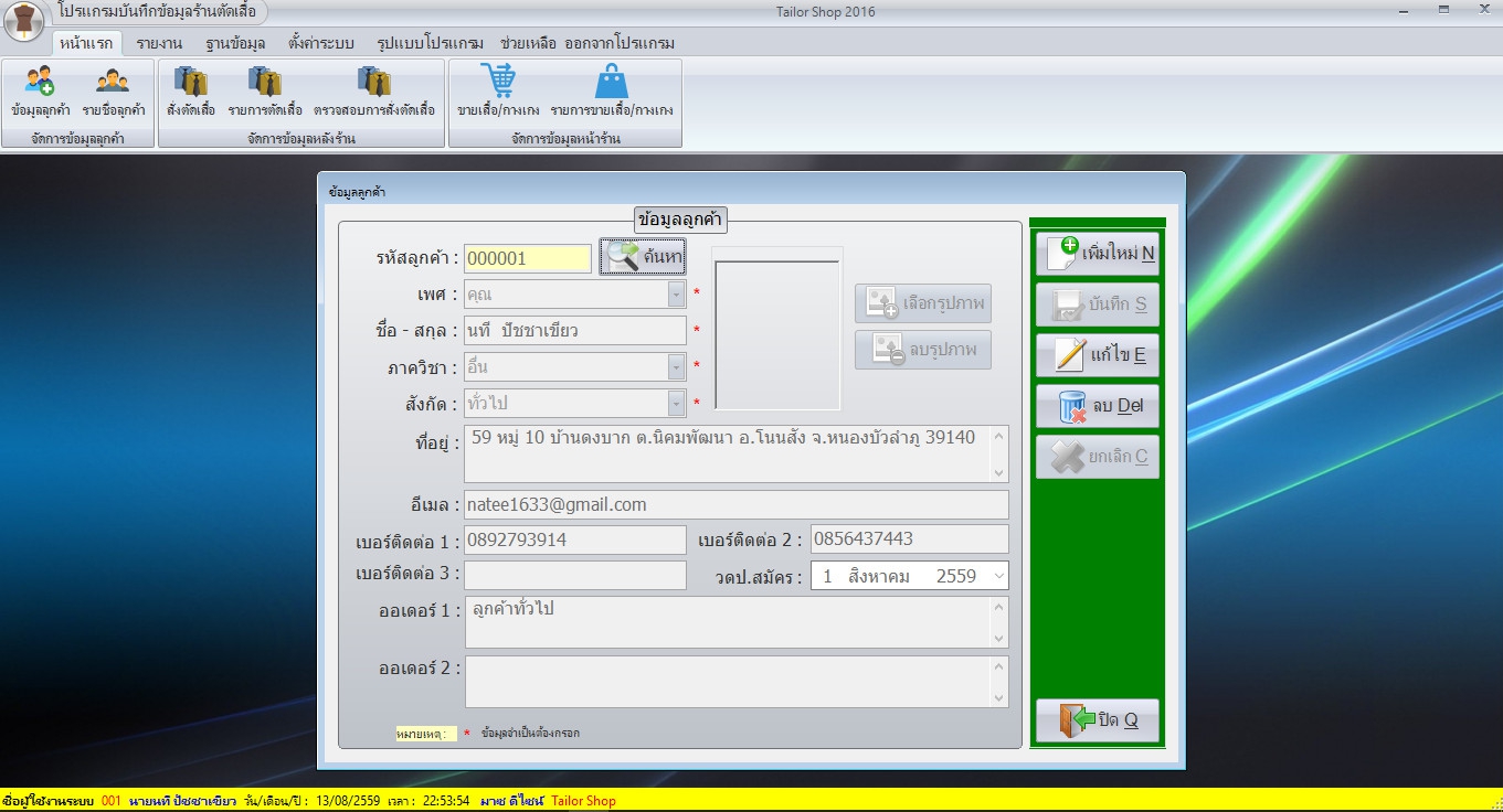 โปรแกรมร้านตัดเสื้อ บันทึกข้อมูล สั่งตัดเสื้อ Tailor Shop จะช่วยให้ข้อมูลและรายละเอียดการดิดต่อลูกค้าไม่สูญหายอีกต่อไป สามารถจัดเก็บข้อมูลลูกค้าได้แบบครบ ๆ ไม่ว่าจะเป็น ชื่อ นามสกุล เพศ ที่อยู่ อีเมล เบอร์โทรศัพท์ รวมถึงรหัสลูกค้า เป็นต้น ทำให้ค้นหาหรืออ้างอิงข้อมูลลูกค้าได้ง่าย