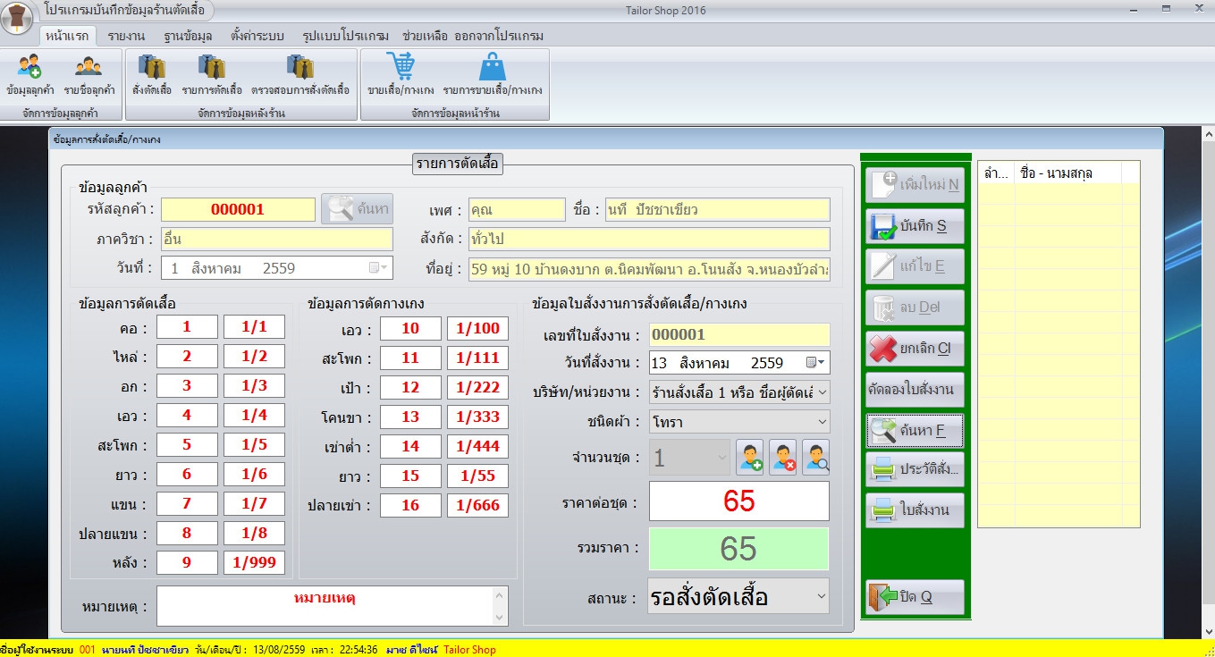 โปรแกรมร้านตัดเสื้อ บันทึกข้อมูล สั่งตัดเสื้อ Tailor Shop ได้รับการออกแบบมาอย่างเข้าใจกิจการร้านรับสั่งตัดเสื้ออย่างแท้จริง สามารถจัดเก็บรายละเอียดการวัดตัวของลูกค้าได้อย่างครบถ้วน ไม่ว่าจะเป็น ขนาดของ คอ ไหล่ อก เอว สะโพก แขน ปลายแขน หลัง เป้า โคนขา เป็นต้น รวมถึงจัดเก็บข้อมูลชนิดของเนื้อผ้าที่ใช้ในการตัดเย็บ แก้ปัญหาความคลาดเคลื่อนจากการจดข้อมูลด้วยลายมือ และแก้ปัญหาข้อมูลสูญหายจากการจดลงบนแผ่นกระดาษได้เป็นอย่างดี