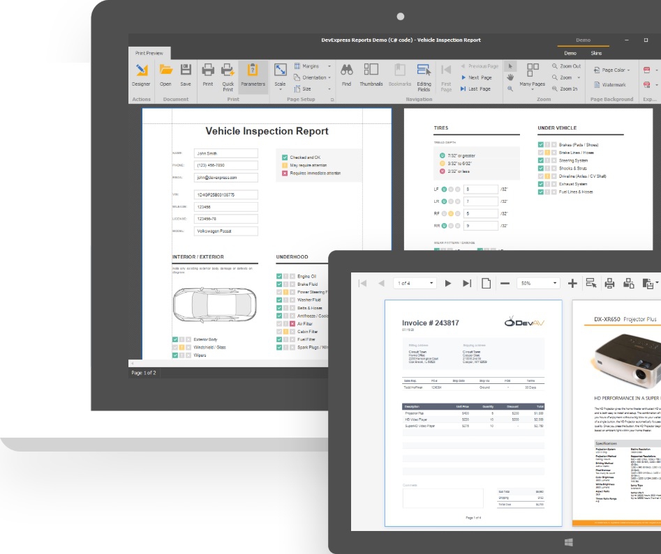โดยที่ใน โปรแกรมรวมชุด Control ด้านการพัฒนาโปรแกรม DevExpress DXperience มีชุดเครื่องมือสำหรับการสร้างแบบฟอร์มรายงานที่ใช้งานง่ายในรูปแบบของ Wizard รวมถึงมีเทมเพลตสำเร็จรูปสำหรับการออกรายงาน และมีเครื่องมือการออกแบบรายงานที่ใช้งานง่าย ปรับแต่งรูปแบบของรายงานได้อย่างไร้ข้อจำกัด โดยที่รองรับการสร้างรายงาน สำหรับแพลตฟอร์ม ดังต่อไปนี้