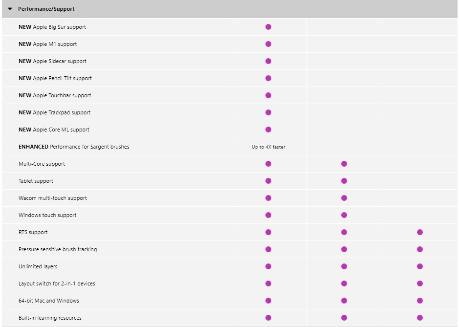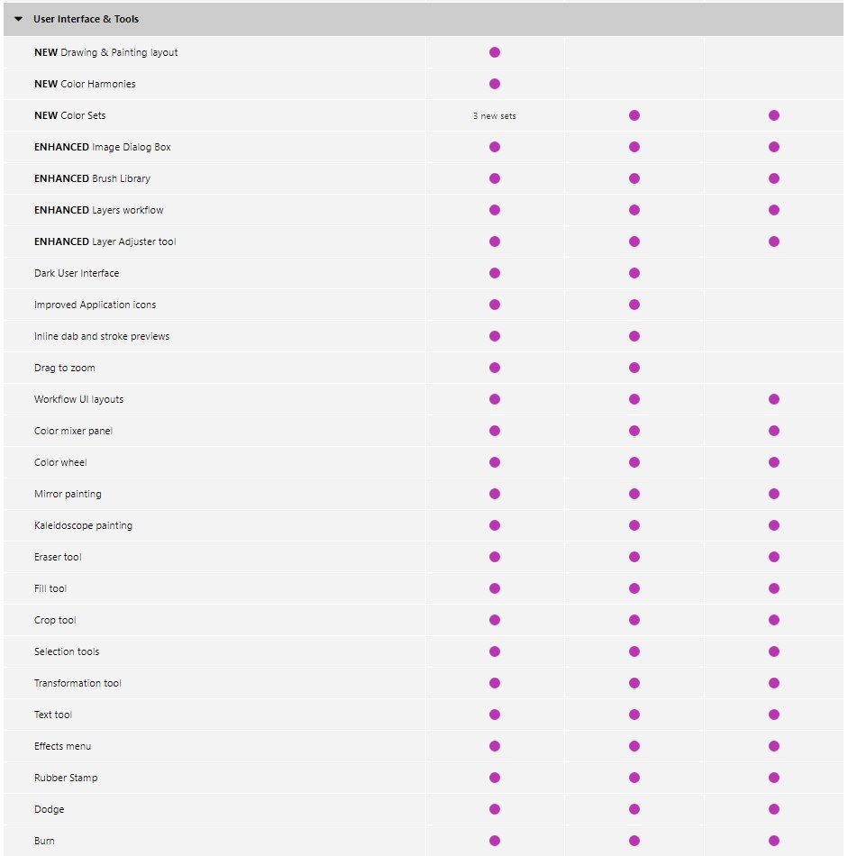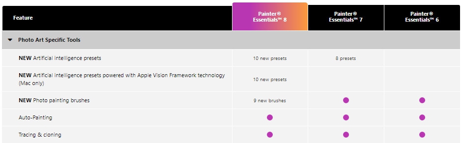 ตารางเปรียบเทียบ โปรแกรมวาดรูป Corel Painter Essentials ในแต่ละเวอร์ชัน