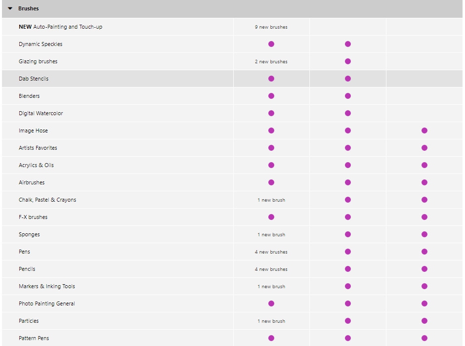 โปรแกรมวาดรูปสำหรับผู้เริ่มต้น Corel Painter Essentials นั้นได้รวบรวมรูปแบบแปรงยอดนิยม ที่เหล่าศิลปินไว้วางใจ (Artist-trusted Brushes) เพื่อให้คุณได้สัมผัสประสบการณ์ที่ยอดเยี่ยม และสร้างสรรค์ผลงานที่แตกต่าง โดยมีรูปแบบแปรงให้เลือกมากมาย ดังนี้