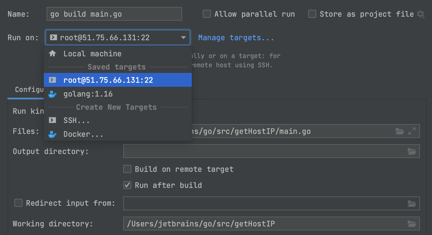 โปรแกรมรวมเครื่องมือสำหรับผู้พัฒนาภาษาโก Jetbrains GoLand 2025 เปิดโอกาสให้เราสามารถเขียนโค้ด และเก็บโค้ดนั้นไว้บนเครื่องของเราเอง และสามารถส่งโค้ดนั้นไปรันบนเครื่องอื่นที่เป็นเป้าหมายได้ โดยที่ IDE ตัวนี้รองรับรูปแบบการส่งโค้ดไปรันในเครื่องอื่นได้หลายวิธีการ อาทิ Docker, SSH และ WSL 2