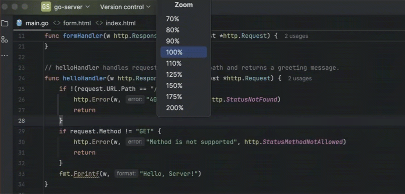 โปรแกรมรวมเครื่องมือสำหรับผู้พัฒนาภาษาโก Jetbrains GoLand 2025 ช่วยให้นักพัฒนา ทำงานได้อย่างสบายใจ สบายตา ด้วยความสามารถในการปรับซูมขยายในทุกส่วนของ ส่วนประสานงานกับผู้ใช้ (UI) เพื่อให้มองเห็นทุกส่วนประกอบได้ใหญ่เต็มตา โดยการสั่งปรับซูมได้จากที่เดียว และยังสามารถสร้างทางลัดเพื่อการเรียกใช้คำสั่งการขยายซูมได้อย่างรวดเร็ว สามารถปรับ ย่อ/ขยาย ขนาดการแสดงผลของ IDE ได้ในช่วง 70 - 200% เพื่อให้ได้สภาพแวดล้อมการทำงานที่เหมาะที่สุด