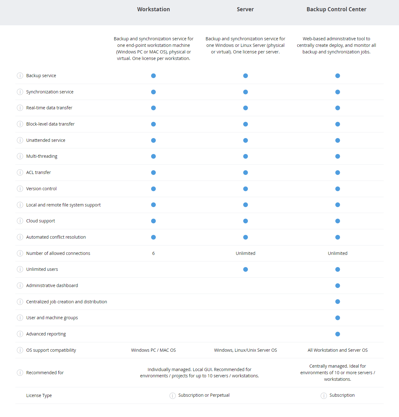 โปรแกรมสำรองข้อมูล รุ่นสำหรับเซิร์ฟเวอร์ มาพร้อมฟีเจอร์ทุกอย่างที่มีอยู่ในรุ่น Workstation แต่สิ่งที่มีเพิ่มเข้ามาในรุ่น Server คือ รองรับการใช้งานบน ระบบปฏิบัติการ Linux และ Windows ที่เป็นเวอร์ชัน Server โดยใช้งานได้ทั้งบนเซิร์ฟเวอร์แบบกายภาพ (Physical Server) และเครื่องเซิร์ฟเวอร์เสมือน (Virtual Server) โดยเป็นลิขสิทธิ์แบบ Perpetual เสียเงินครั้งเดียวใช้งานได้ตลอดไป รองรับการติดตั้งใช้งานบนเซิร์ฟเวอร์ 1 เครื่อง ได้รับการอัปเดตโปรแกรม และได้รับการ Support ทางเทคนิคจากผู้พัฒนาโปรแกรมเป็นระยะเวลา 5 ปี