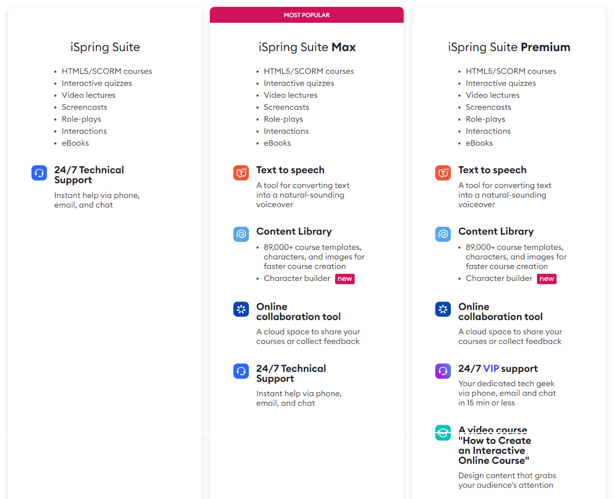 โปรแกรมสร้างบทเรียนดิจิทัล บทเรียนออนไลน์ รุ่นระดับสูง มีความสามารถเทียบเท่าโปรแกรมเวอร์ชัน Suite ทุกประการ แต่สิ่งที่เพิ่มเข้ามาในเวอร์ชัน Suite Max คือ มาพร้อมกับ Content Library ที่มีเทมเพลตสำหรับการสร้างแบบเรียนดิจิทัล หรืองานนำเสนอ ให้เลือกใช้ได้กว่า 89,000 รูปแบบ พร้อมภาพของตัวละครชายหญิงที่บุคลิกแตกต่างหลากหลาย ให้ได้เลือกนำไปใช้เพื่อประกอบการเล่าเรื่อง และมาพร้อมกับ iSpring Space พื้นที่บนออนไลน์ สำหรับการจัดเก็บงาน และเป็นช่องทางที่ให้ทีมงานสามารถสร้างสรรค์แบบเรียน หรืองานนำเสนอร่วมกันได้