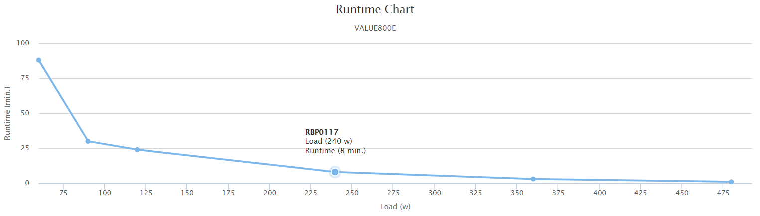 เครื่องสำรองไฟคอมพิวเตอร์ CyberPower VALUE 800 E-AS รองรับกำลังการจ่ายไฟสูงสุด 480 วัตต์ โดยกราฟแสดงระยะเวลาการจ่ายพลังงานสำรองของ UPS รุ่นนี้ตามภาพด้านบน (Runtime Chart) ระบุว่า