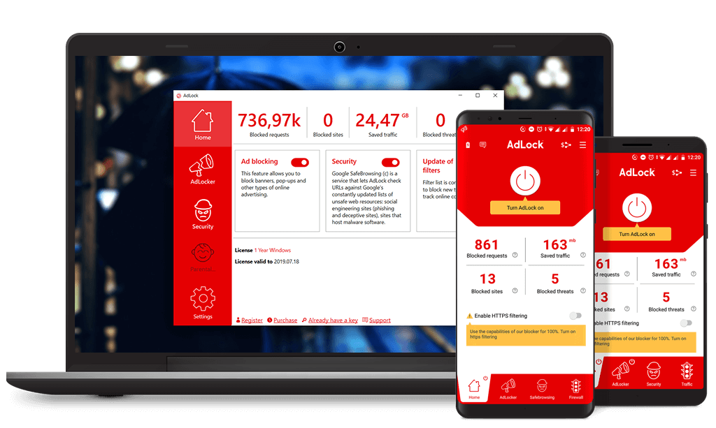 AdLock โปรแกรมปิดบล็อกการแสดงแบนเนอร์โฆษณา ทั้งสำหรับเครื่อง PC และอุปกรณ์ Android ด้วยประสิทธิภาพการทำงานในระดับก้าวหน้า กว่าโปรแกรมอื่นๆ ในรูปแบบเดียวกัน สามารถปิดกันการแสดงโฆษณาทุกรูปแบบบนหน้า เว็บเบราว์เซอร์ (Web Browser) ในขณะที่เราท่องอินเทอร์เน็ต รวมถึงปิดบล็อกการแสดงแบนเนอร์โฆษณาที่น่ารำคาญในแอปพลิเคชันต่างๆ บนระบบ Android และยังมีความสามารถในการสกัดกั้นการติดตามการท่องโลกออนไลน์ของเรา ป้องกันการล่อลวงนบนอินเทอร์เน็ต (Phishing) ที่จะนำพาเราไปยังเว็บไซต์ประสงค์ร้าย แล้วแอบลักลอบขโมยข้อมูลของเรา