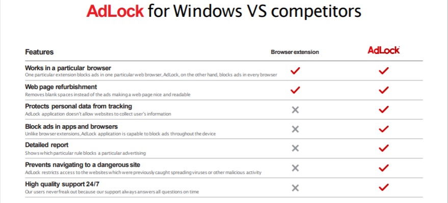 โปรแกรม AdLock สำหรับระบบปฏิบัติการ Windows มีความสามารถในการปิดบล็อกการแสดงแบนเนอร์โฆษณาต่างๆ ในเว็บไซต์ รวมถึงการแสดงแบนเนอร์โฆษณาที่มีอยู่ในโปรแกรมต่างๆ และยังสามารถปิดบล็อกการเข้าถึงเว็บไซต์ หรือโปรแกรมที่มีอันตรายแฝงอยู่ เพื่อรักษาความปลอดภัยให้กับข้อมูล และความเป็นส่วนตัวของเรา และทำให้โหลด และแสดงผลหน้าเว็บได้เร็วขึ้นด้วย