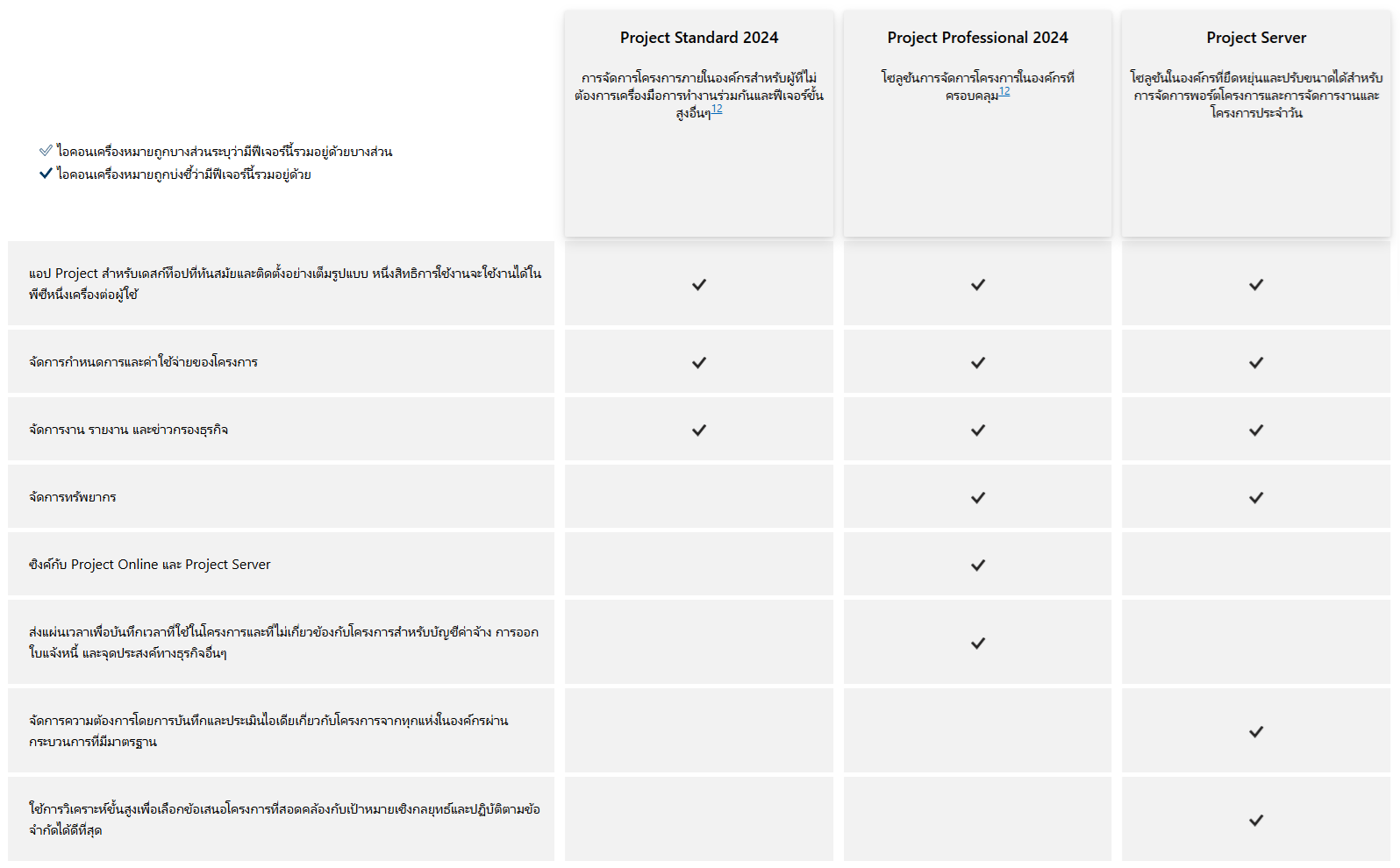 ตารางเปรียบเทียบ โปรแกรมบริหารจัดการโครงการ Microsoft Project แต่ละเวอร์ชัน