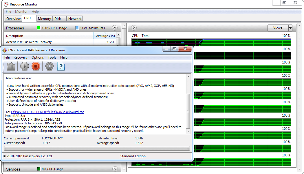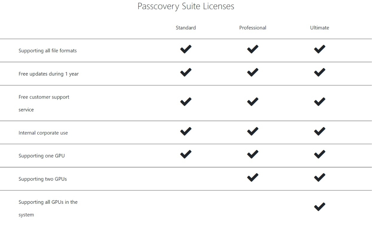 ทั้งนี้ โปรแกรมกู้รหัสผ่าน รุ่นมาตรฐาน Passcovery Suite Standard การันตีเรื่องความเร็วในการปลดล็อกรหัสผ่านที่มีความแน่นหนา และใช้ขุมพลังจากชิป หน่วยประมวลผลกราฟิก (GPU) ของทั้ง NVIDIA หรือ AMD ในการปลดล็อก