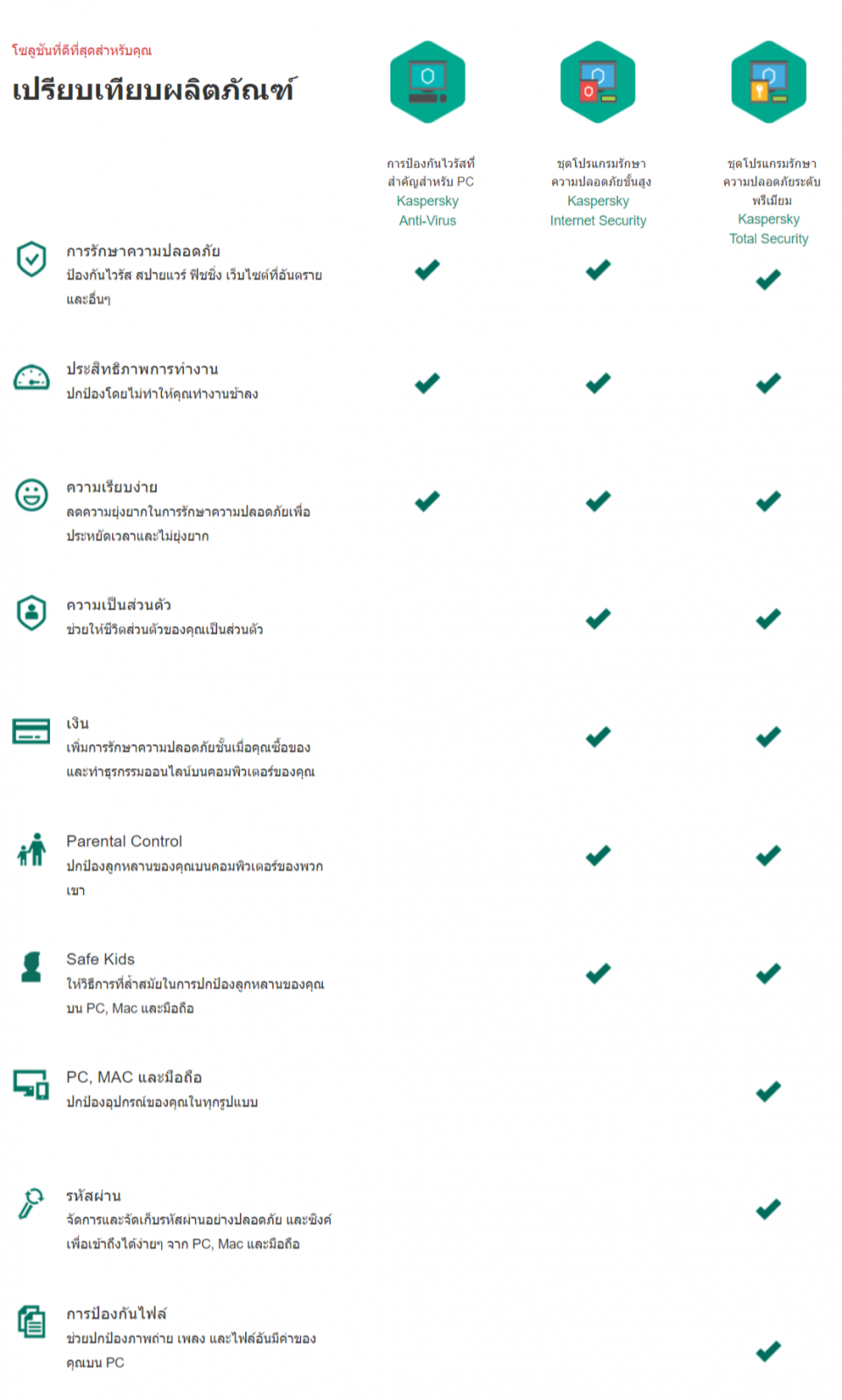 ตารางเปรียบเทียบ โปรแกรม Kaspersky ในแต่ละเวอร์ชัน